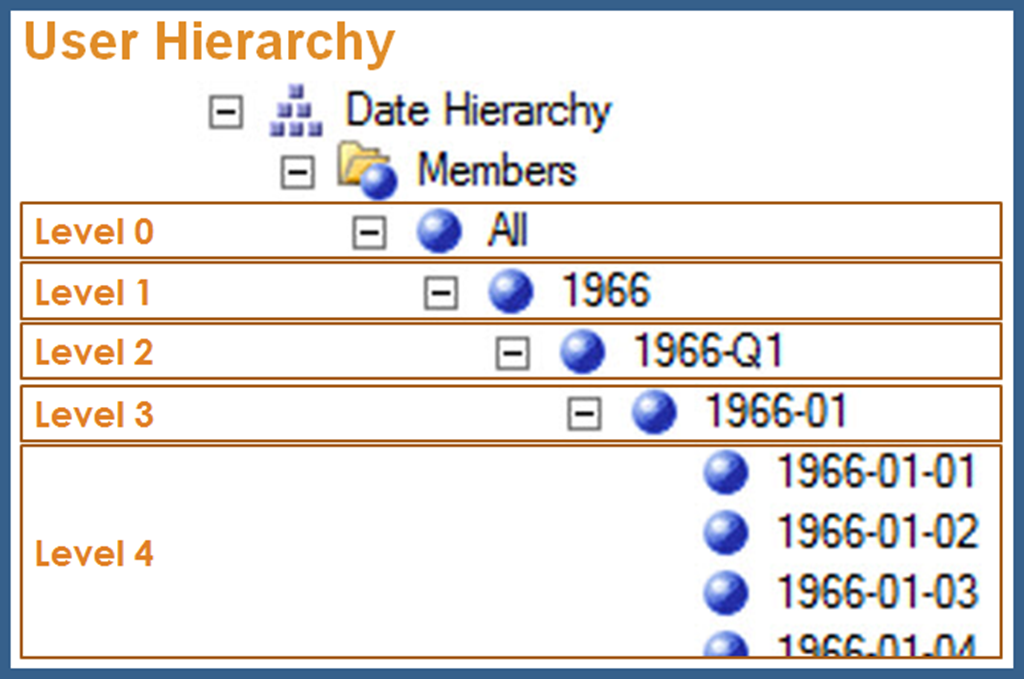 User Hierarchy: A hierarchy composed of more than one attribute. Figure 2 shows an example.