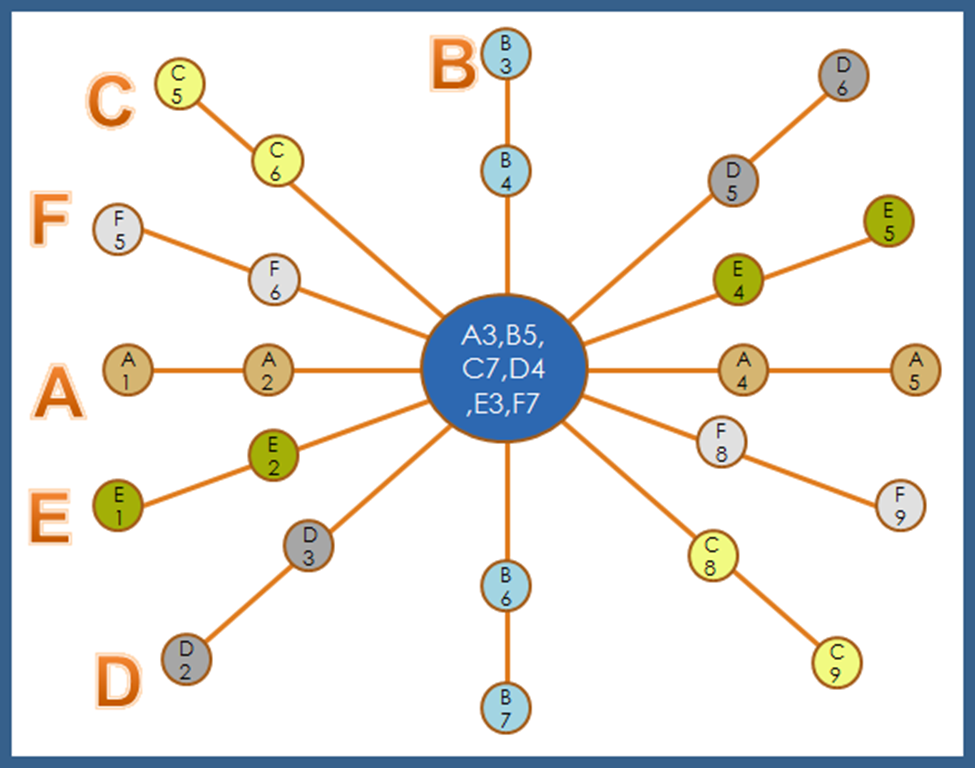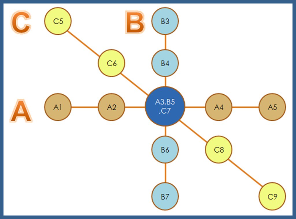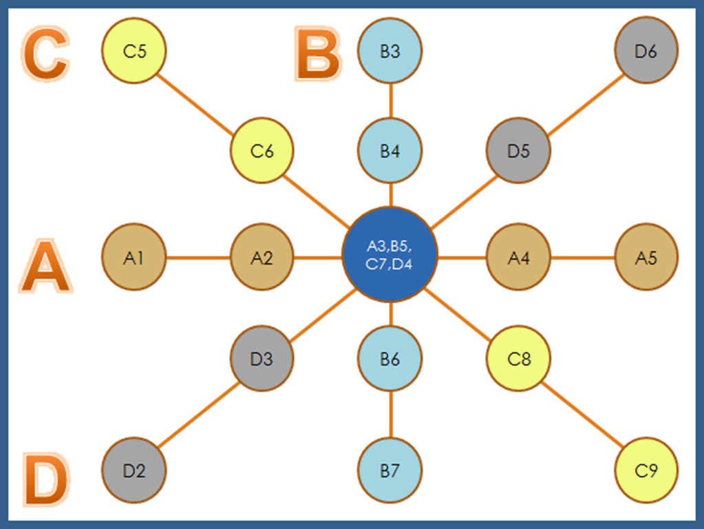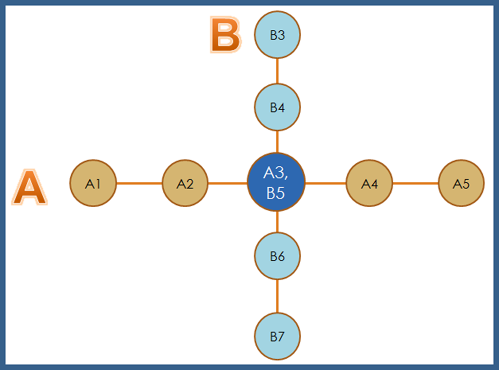 In this space, we can reference a particular location using the coordinates (A3,B5). This names a particular intersection of Dimension A and Dimension B.