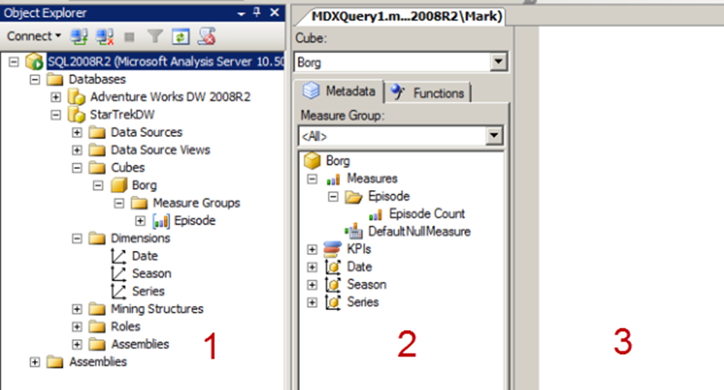 Notice the Result 2 is identical to Result 1. They both return the exact same set of members. You notice, also, that they both dealt with the same Attribute Hierarchy. Since you have been basing your life around the release of each new post in this series, you will recall from the first post, Intro To MDX Decathlon – Cube Space: The Final Frontier (1/10), that an Attribute Hierarchy is one that contains only a single Attribute. The [Series].[Series Name] hierarchy contains only the [Series Name] attribute.