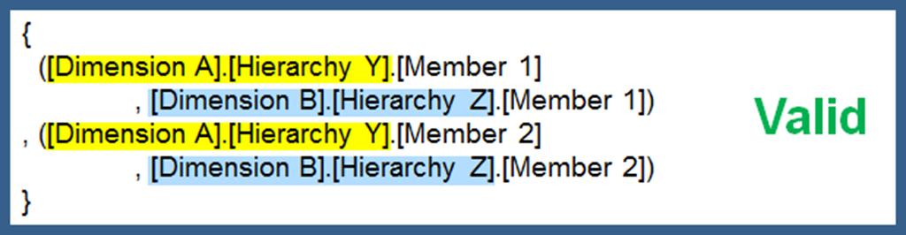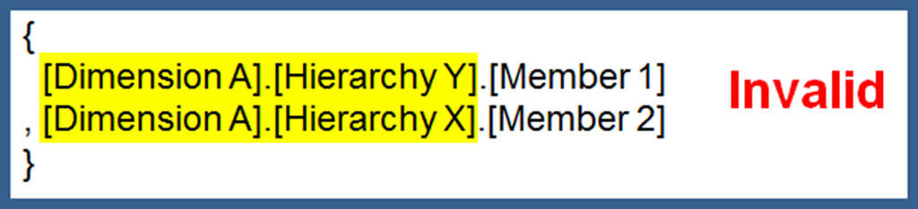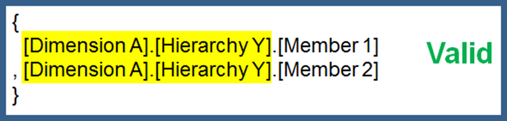 The only difference between Query 2 below and Query 1 is that we specify the name of the hierarchy whose members we want in our set. Although leaving off the hierarchy name, as in Query 1, is technically allowed when the dimension has only one hierarchy, I prefer specifying the hierarchy name anyway, as in Query 2. To me, this makes my MDX more complete and easier for another person to follow.