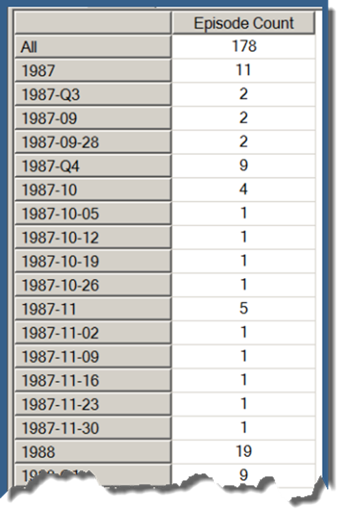 Result 3 still starts with the All member. The next member you see is [Calendar Year].[1987]. This is the FIRST member immediately below the All member that that meets the criteria. We then proceed through all of the members in 1987 before getting to 1988, which would make sense since my [Date Hierarchy] is in ascending Full Date order. Each path in the hierarchy is exhausted before going to the next path. So, every member in [Calendar Quarter].[1987–Q3] appears before anything in [Calendar Quarter].[1987–Q4]. Likewise, every member in [Calendar Month].[1987-09] appears before anything in [Calendar Month].[1987-10]. And so on. You can see that the results of using .members on a User Hierarchy will travel up and down the levels in the hierarchy in order to show every member of every level while still keeping everything in the sort order configured for this hierarchy in the cube. This behavior can be fantastic for some reporting scenarios. Just keep in mind that for very deep or populous hierarchies, this can return a lot of members. Use it wisely.
