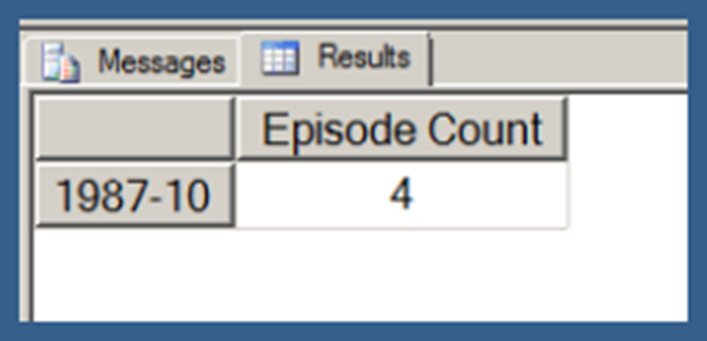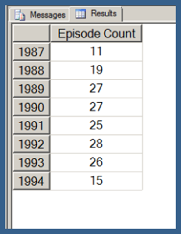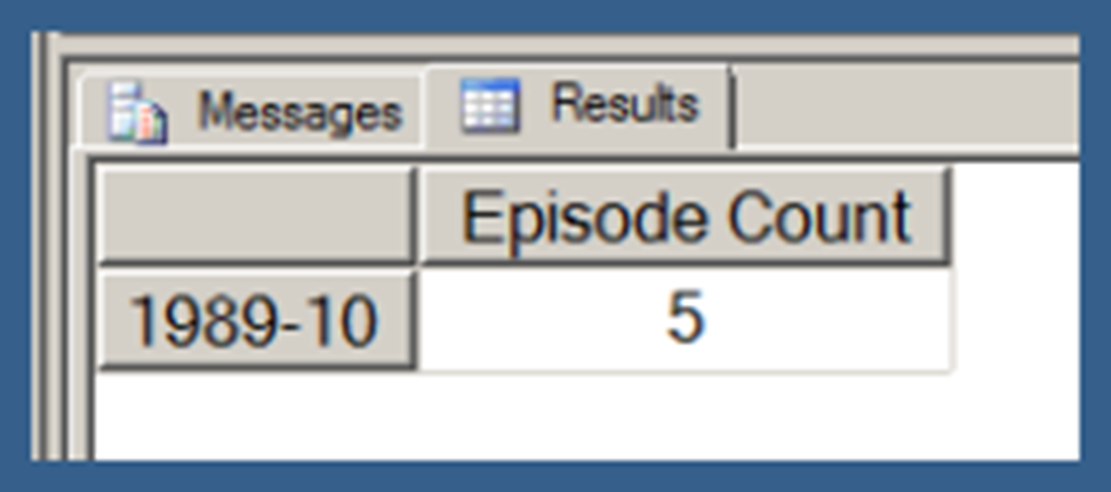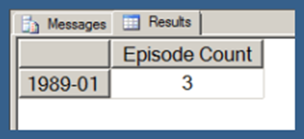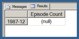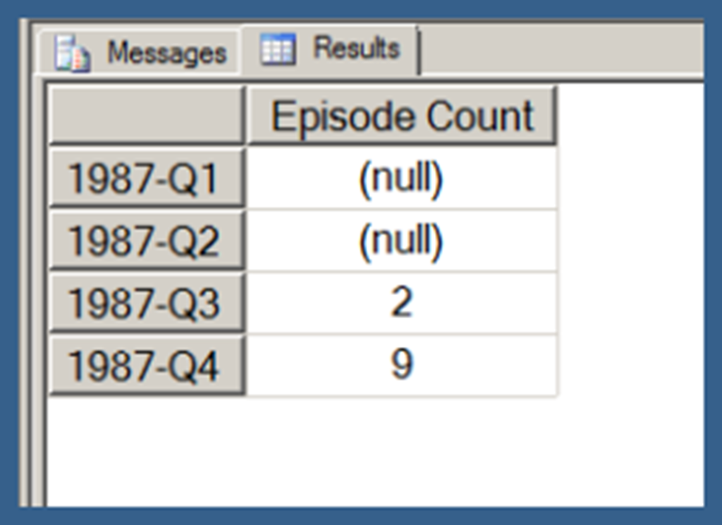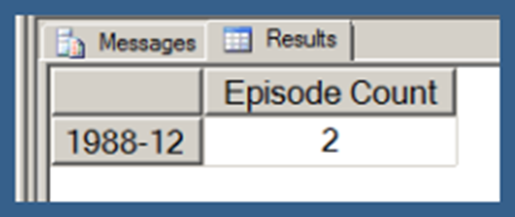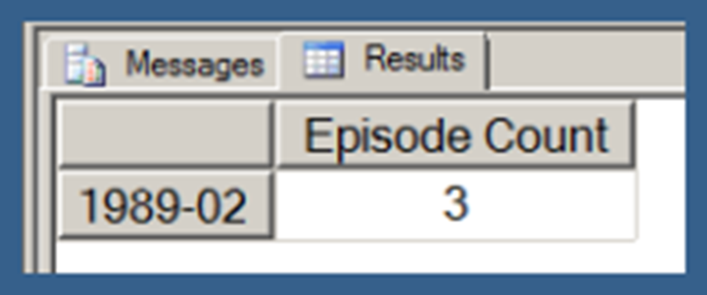 Using .children with a user hierarchy isn’t really very different. In Query 3, I use my [Date].[Date Hierarchy]. Note that Query 3 also uses the NON EMPTY keyword (in conjunction with a Slicer specifying the [Series].[Series Name].[Star Trek: The Next Generation] member) to limit the results just those date hierarchy members that have Episode Counts for Star Trek: The Next Generation. I explain the use of the NON EMPTY keyword in the next post in this series. I am just using that here in order to return a result set that takes less space to display.