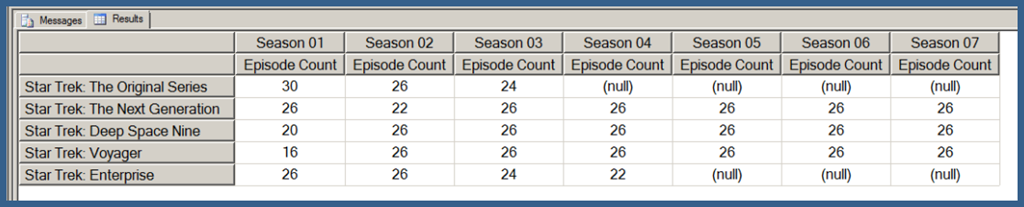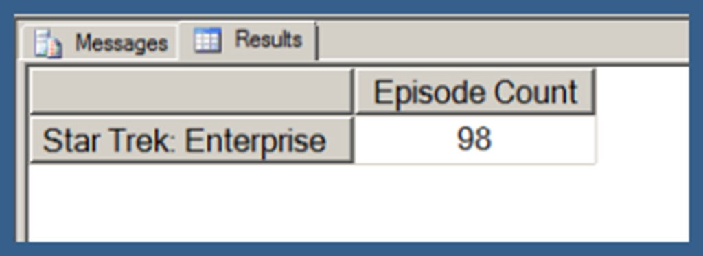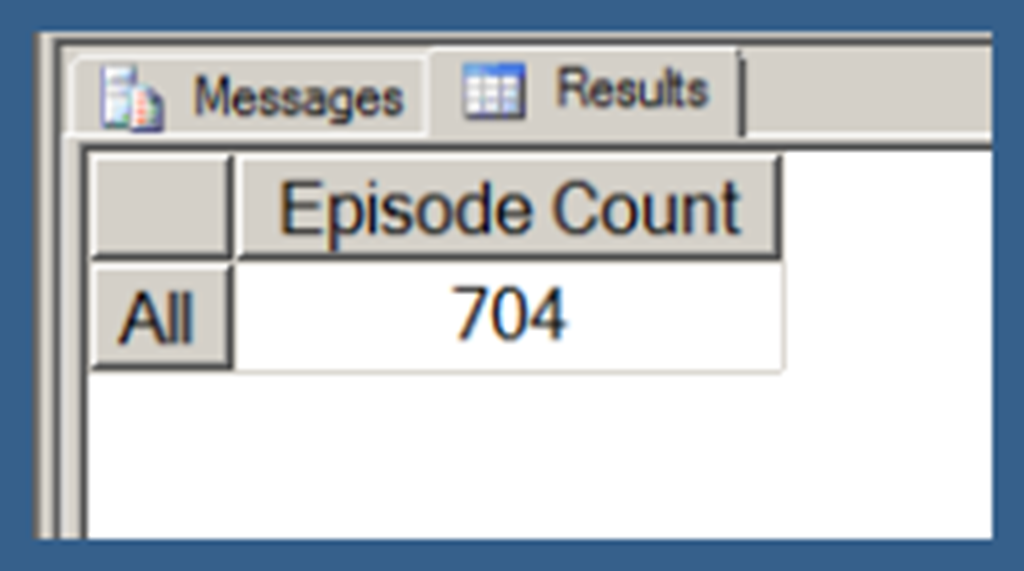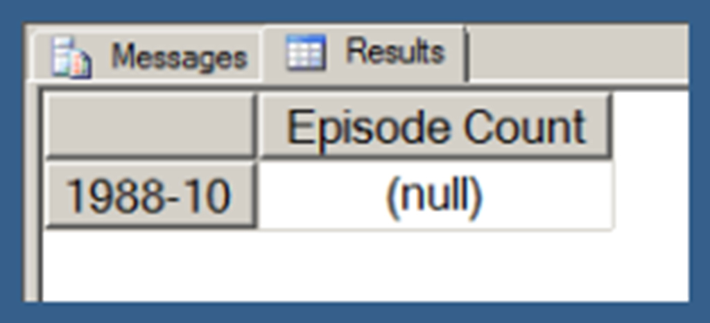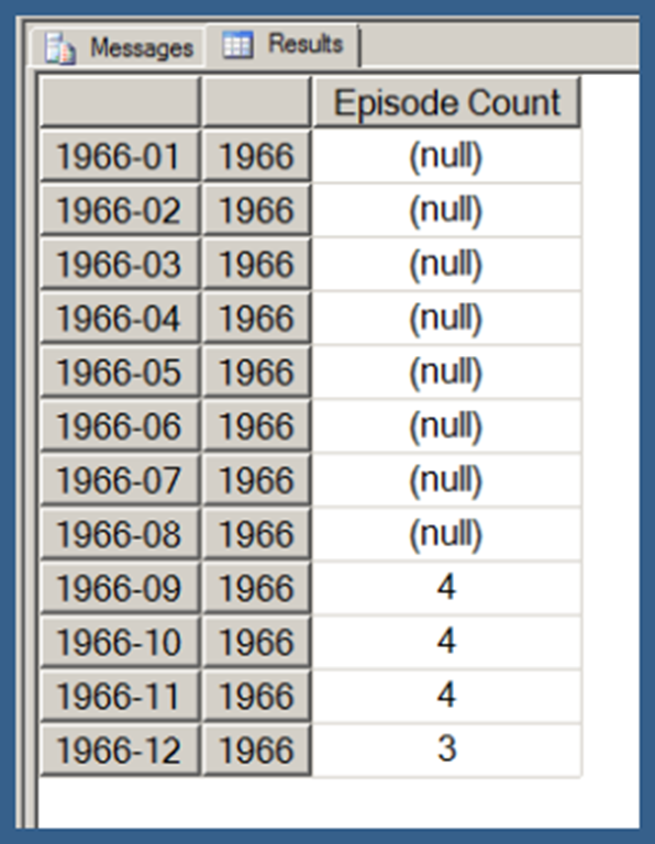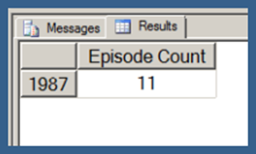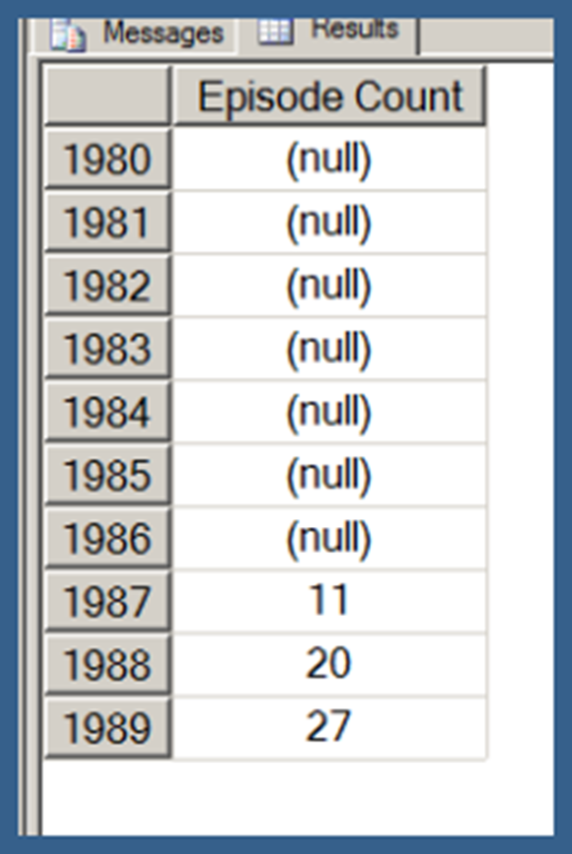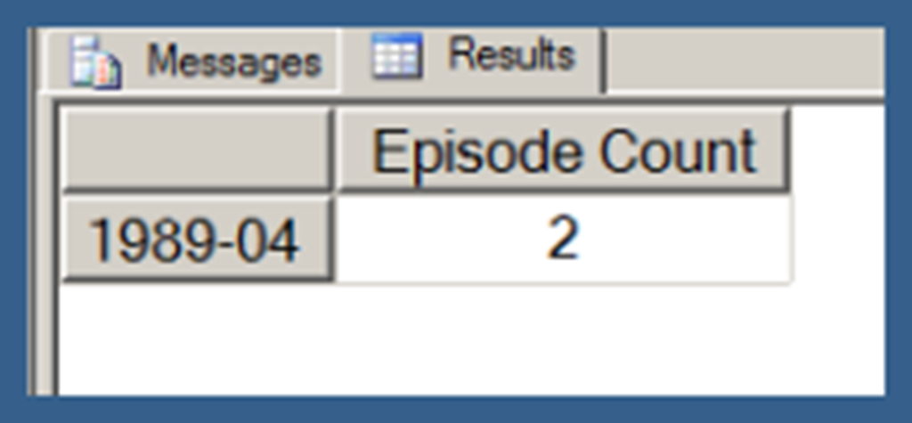 Using .children with a user hierarchy isn’t really very different. In Query 3, I use my [Date].[Date Hierarchy]. Note that Query 3 also uses the NON EMPTY keyword (in conjunction with a Slicer specifying the [Series].[Series Name].[Star Trek: The Next Generation] member) to limit the results just those date hierarchy members that have Episode Counts for Star Trek: The Next Generation. I explain the use of the NON EMPTY keyword in the next post in this series. I am just using that here in order to return a result set that takes less space to display.