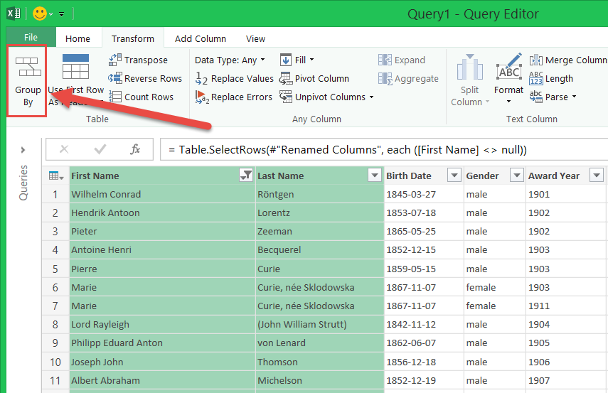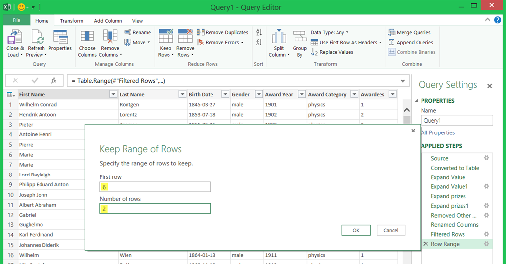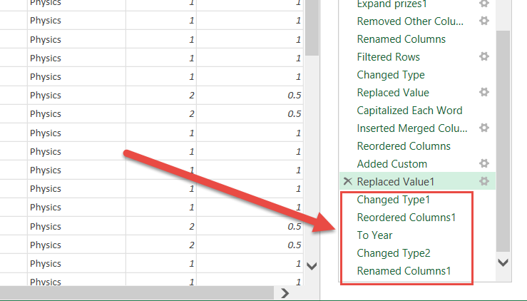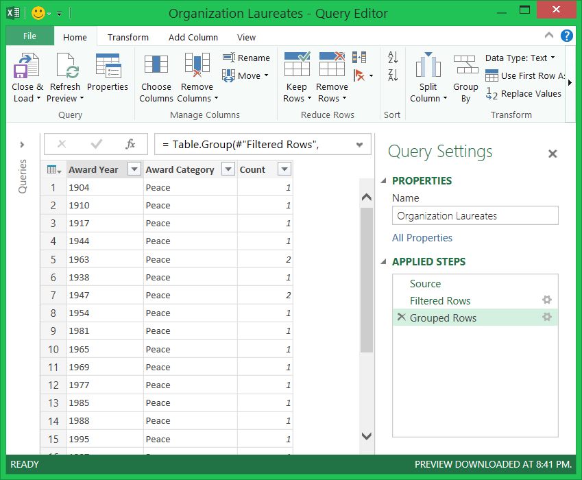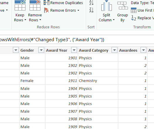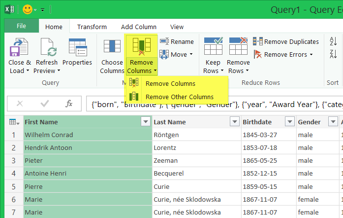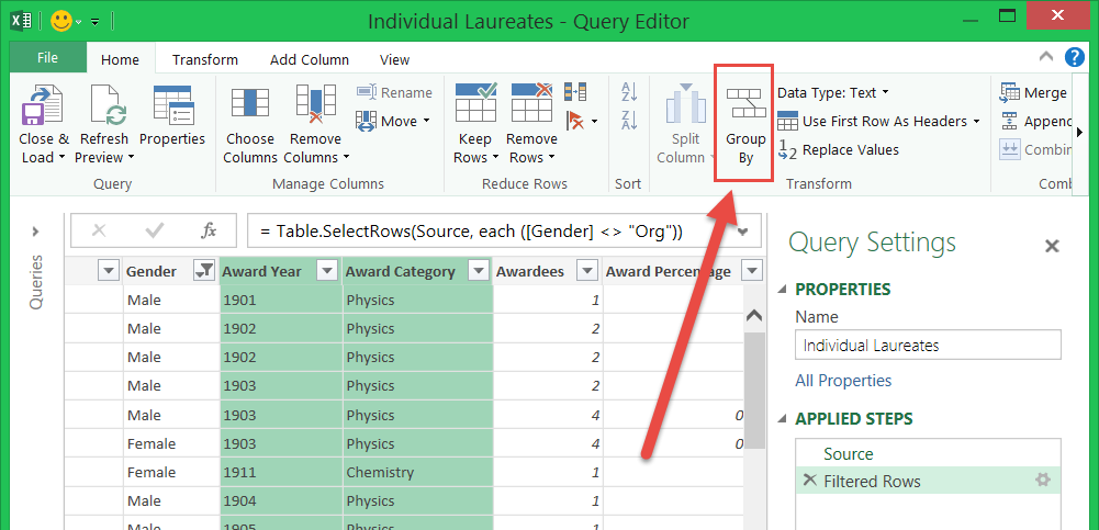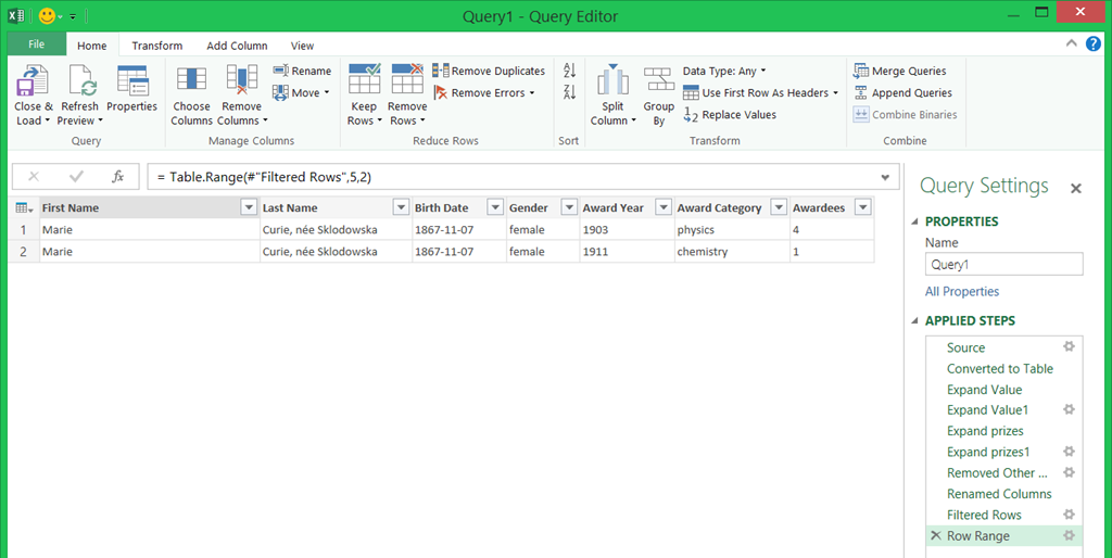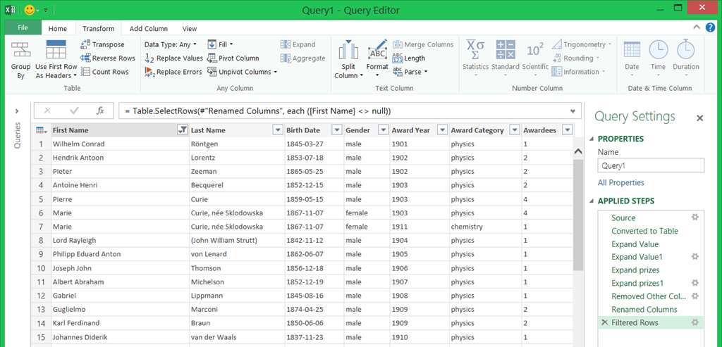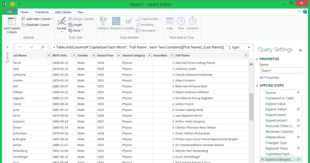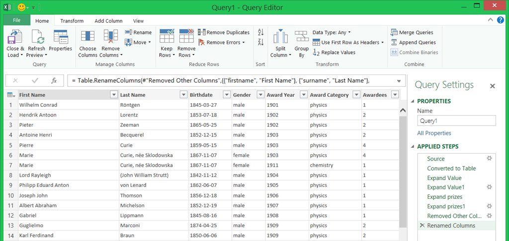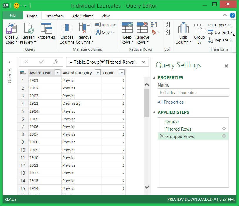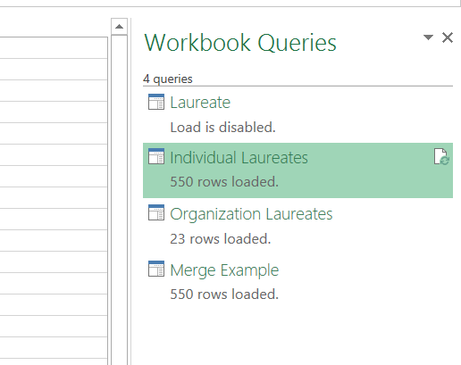 Note: When I first started playing with Reference, I thought it would be a way to break a single source into multiple tables and minimize the impact on the source by only hitting that source once. My testing has shown me that that is not how it works. In the example above, executing (Refreshing) the Individual Laureates query will actually just include all the steps from the Laureate query when it runs. So, rather than execute the Laureate query and then use those results as a source, Power Query takes the steps from the Laureate query and includes them when executing any query Referencing the Laureate query. I tested this by creating a single query against a SQL Server table. I then created 4 other queries via the Reference method above. Tracing the SQL Server instance confirmed that the query was actually querying the source for each and every query, not just once. It seems to me, though, that there could be some advantage if you need to use the same source table multiple times and only want to build the steps to clean up that table once. So, in that sense, the Reference method could be a way to modularize your steps so you can maintain them in one place.