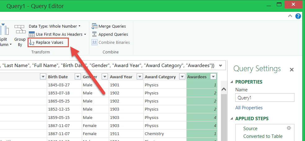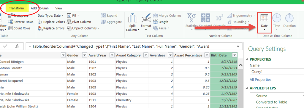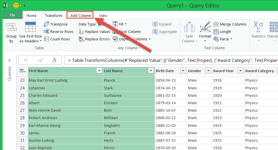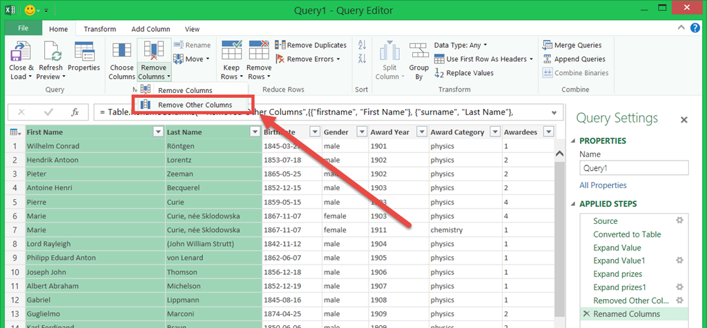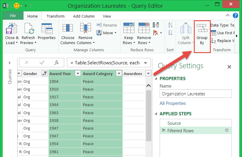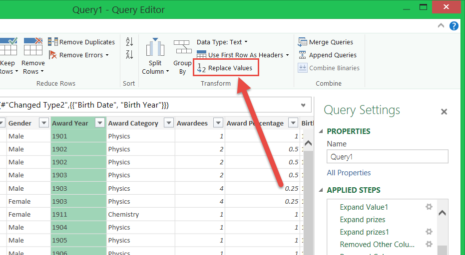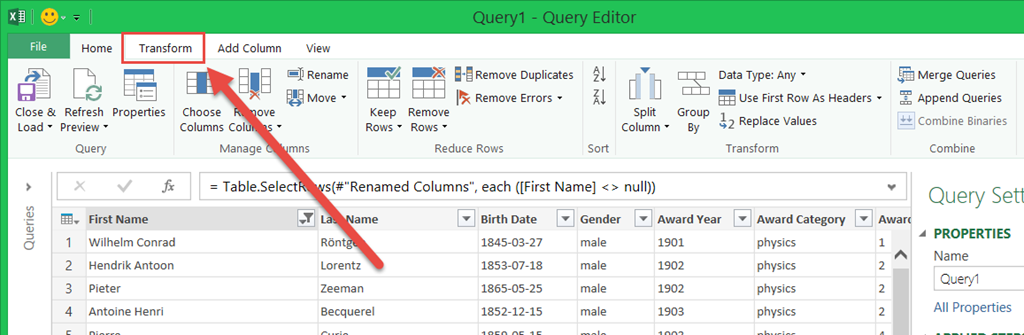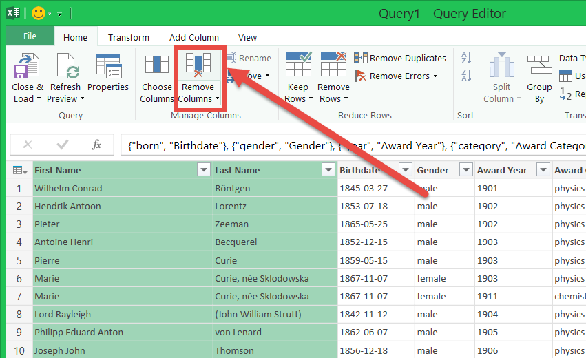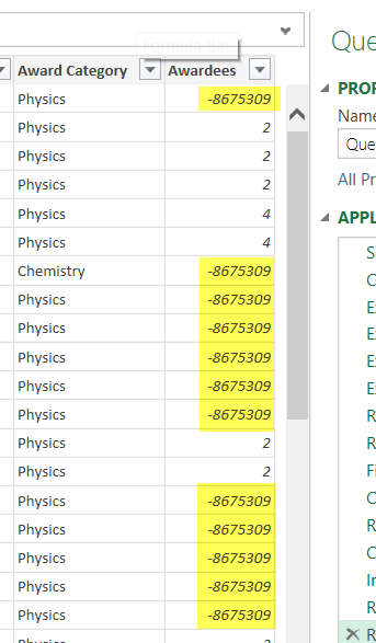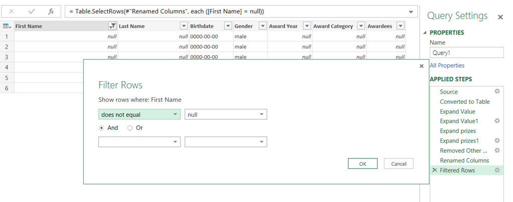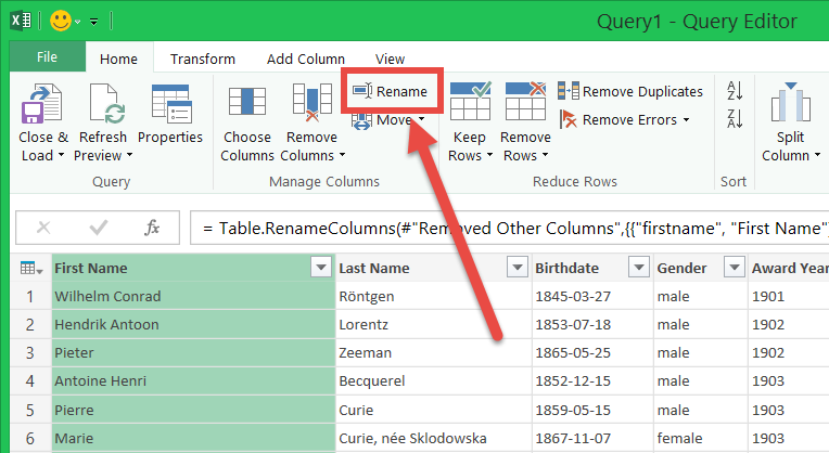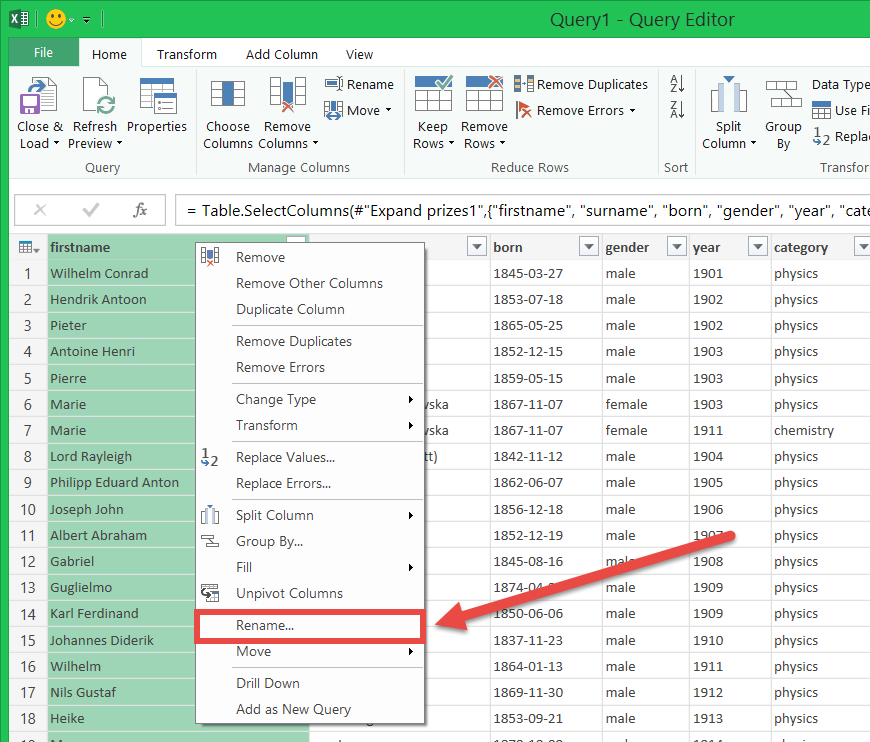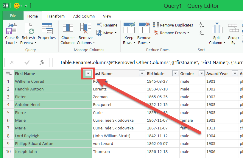 Note: When I first started playing with Reference, I thought it would be a way to break a single source into multiple tables and minimize the impact on the source by only hitting that source once. My testing has shown me that that is not how it works. In the example above, executing (Refreshing) the Individual Laureates query will actually just include all the steps from the Laureate query when it runs. So, rather than execute the Laureate query and then use those results as a source, Power Query takes the steps from the Laureate query and includes them when executing any query Referencing the Laureate query. I tested this by creating a single query against a SQL Server table. I then created 4 other queries via the Reference method above. Tracing the SQL Server instance confirmed that the query was actually querying the source for each and every query, not just once. It seems to me, though, that there could be some advantage if you need to use the same source table multiple times and only want to build the steps to clean up that table once. So, in that sense, the Reference method could be a way to modularize your steps so you can maintain them in one place.