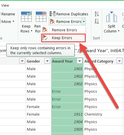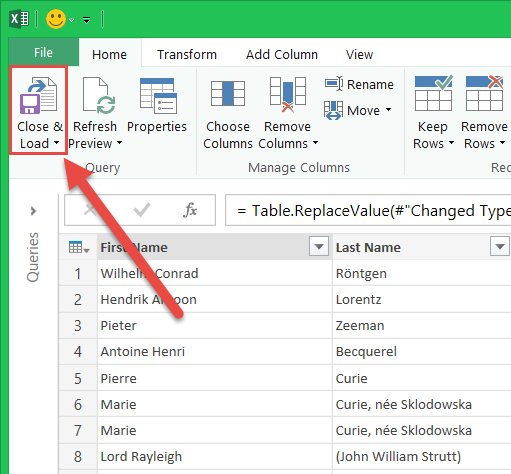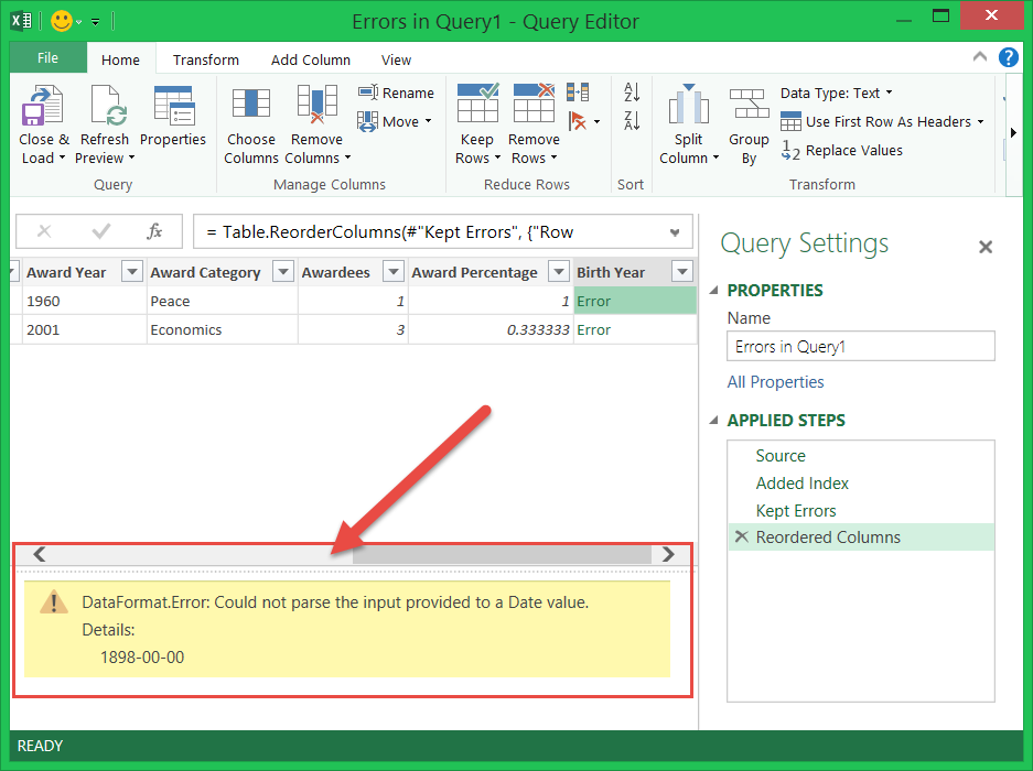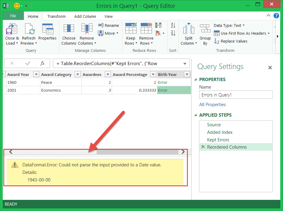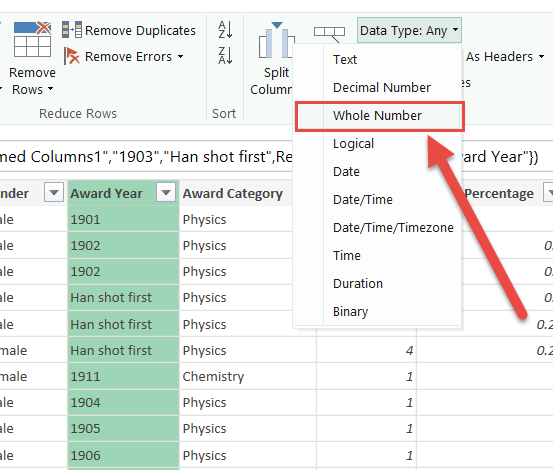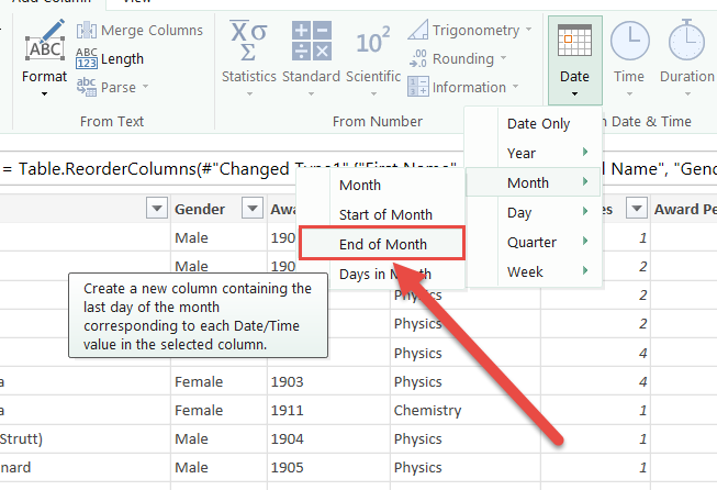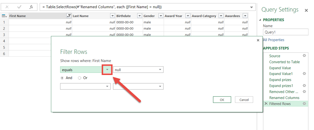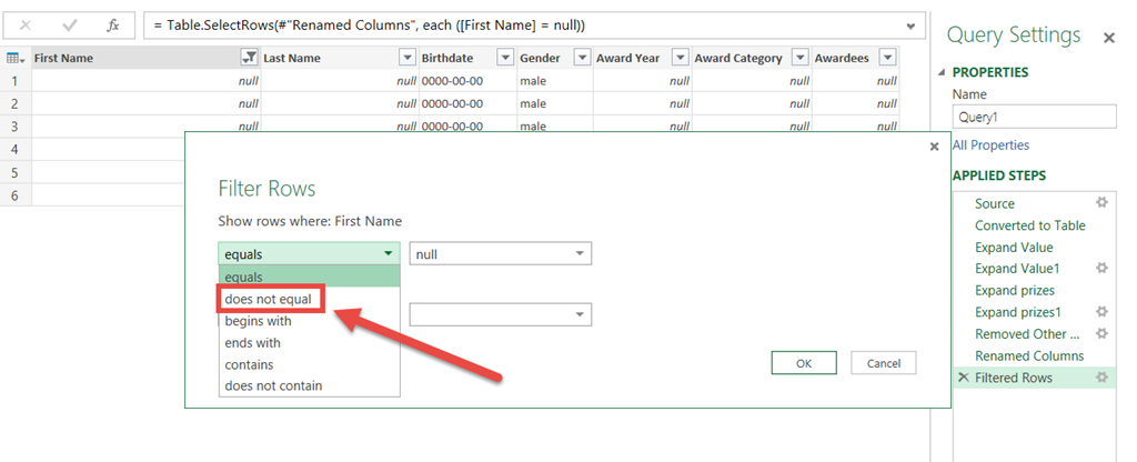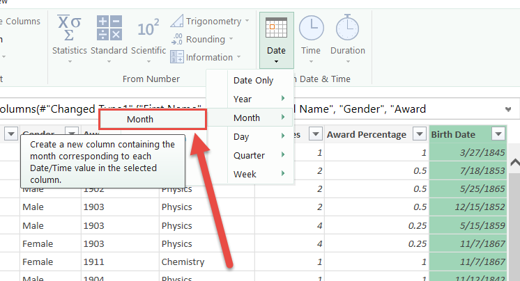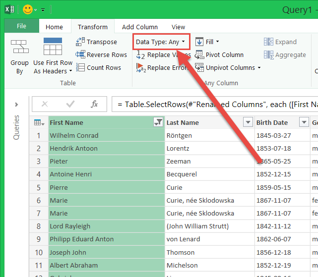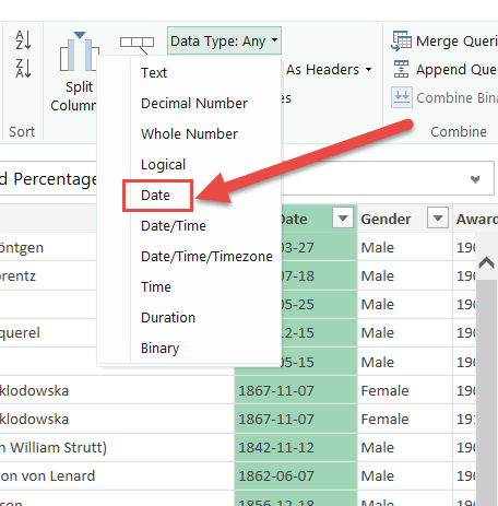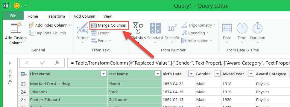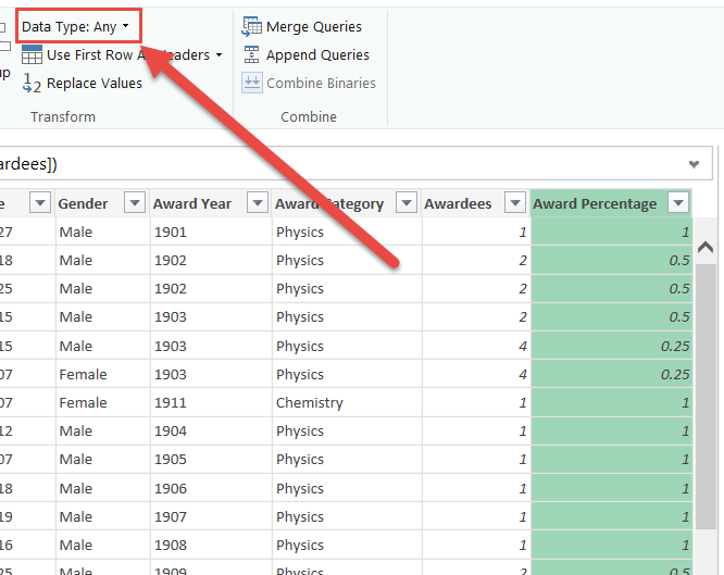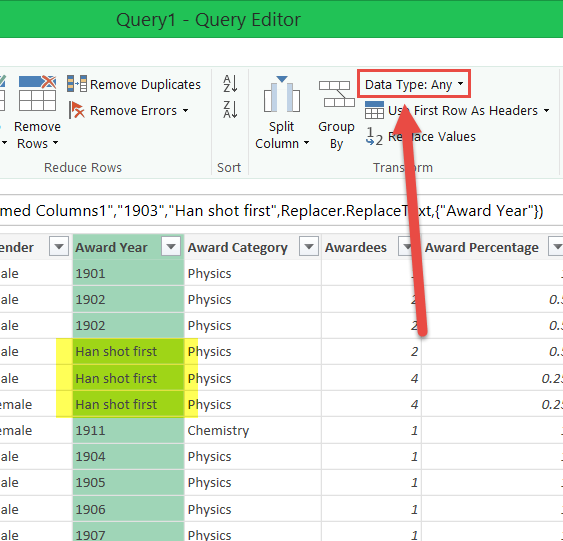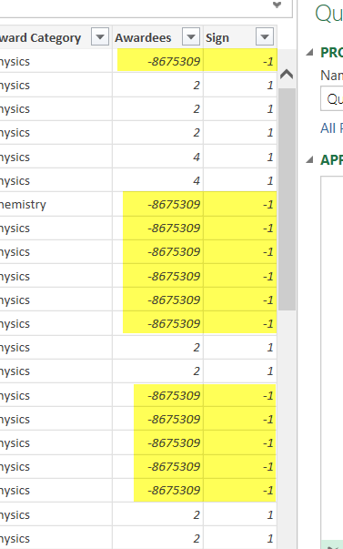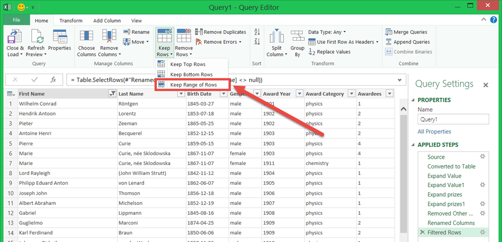 Note: When I first started playing with Reference, I thought it would be a way to break a single source into multiple tables and minimize the impact on the source by only hitting that source once. My testing has shown me that that is not how it works. In the example above, executing (Refreshing) the Individual Laureates query will actually just include all the steps from the Laureate query when it runs. So, rather than execute the Laureate query and then use those results as a source, Power Query takes the steps from the Laureate query and includes them when executing any query Referencing the Laureate query. I tested this by creating a single query against a SQL Server table. I then created 4 other queries via the Reference method above. Tracing the SQL Server instance confirmed that the query was actually querying the source for each and every query, not just once. It seems to me, though, that there could be some advantage if you need to use the same source table multiple times and only want to build the steps to clean up that table once. So, in that sense, the Reference method could be a way to modularize your steps so you can maintain them in one place.