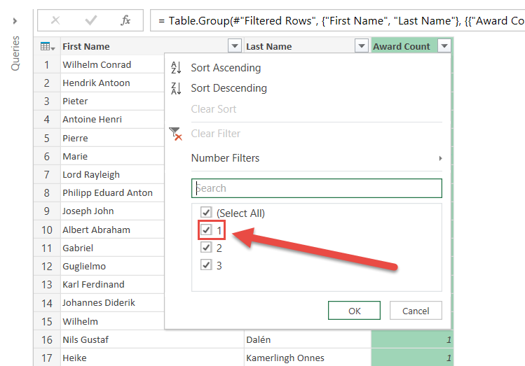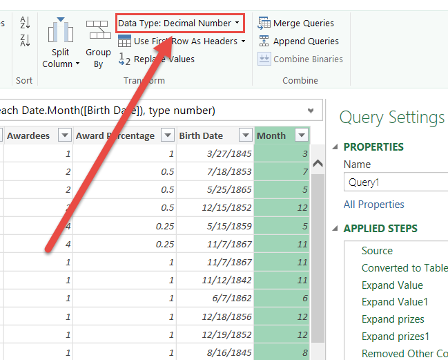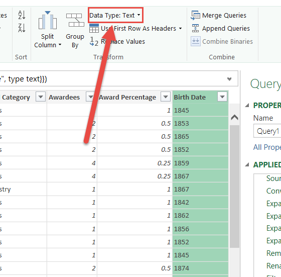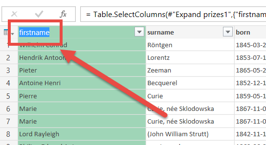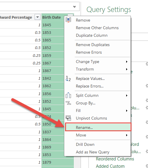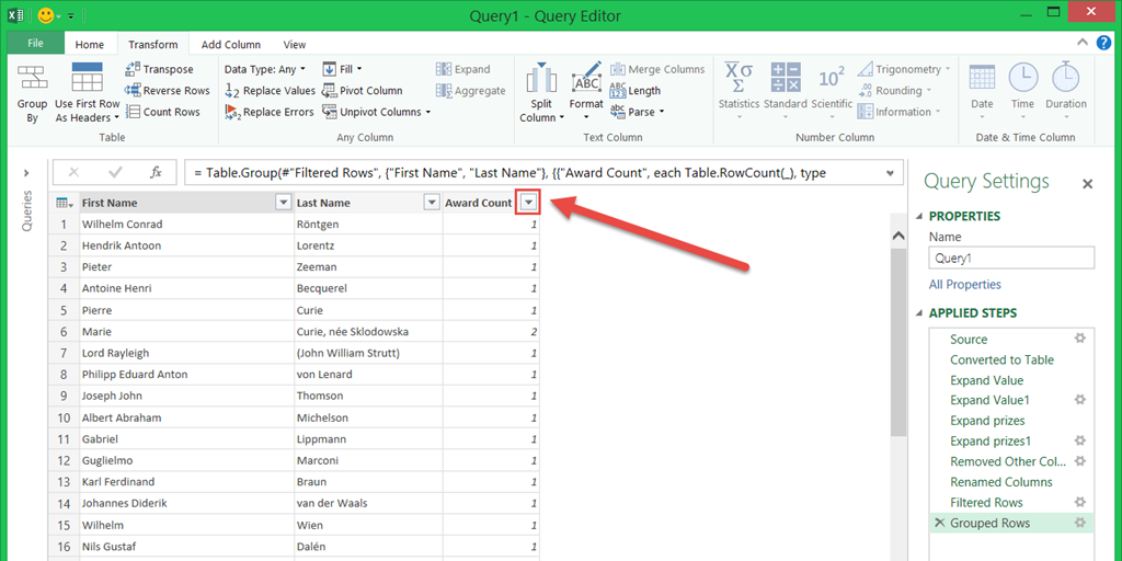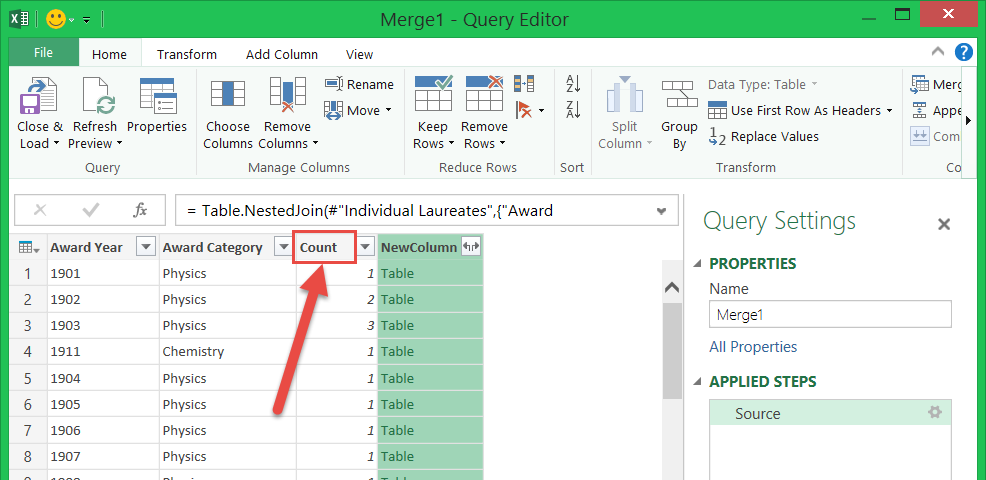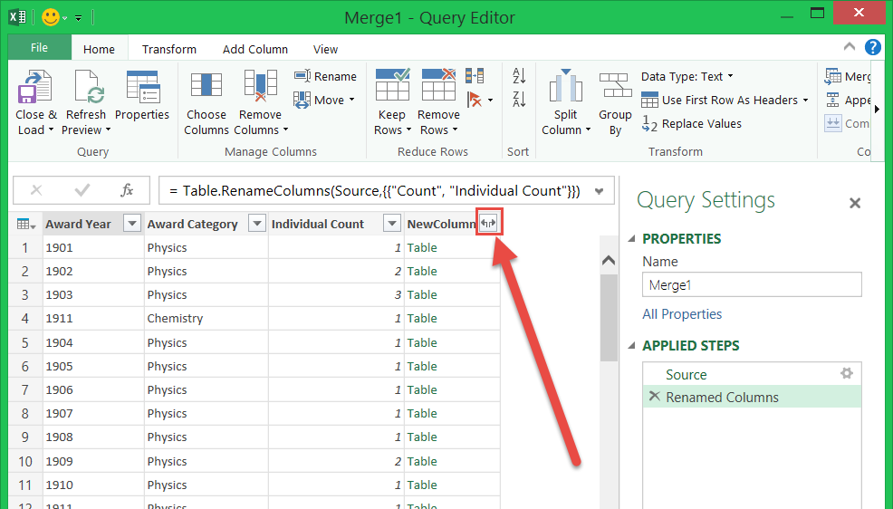 Our next step is to rename the Count column for the Individual Laureates query, shown by the arrow in Figure 25. The reason is that both queries contain a column named Count and and we cannot have duplicate columns names in a single query. Beside, Count is a pretty terrible name anyway. 🙂