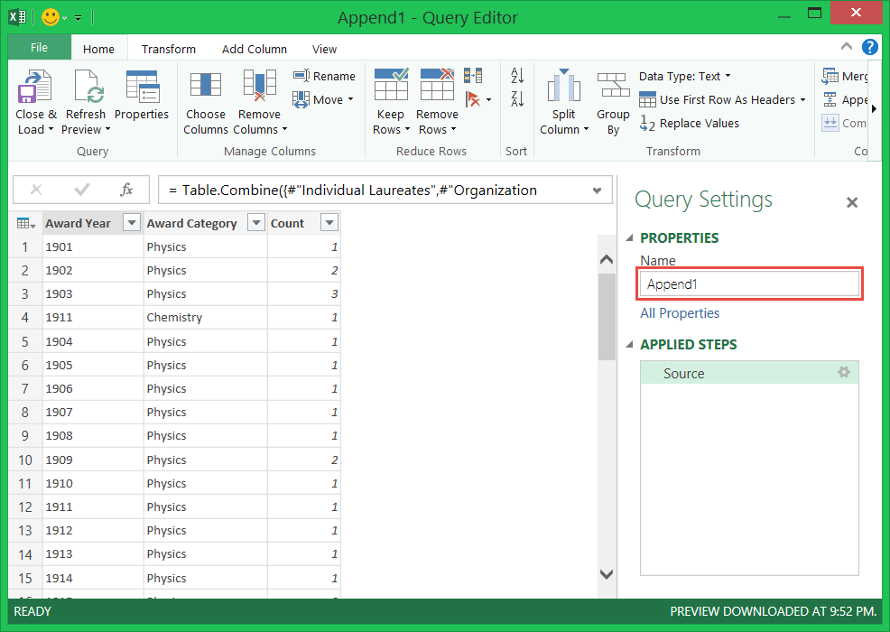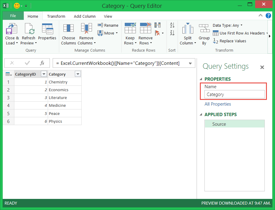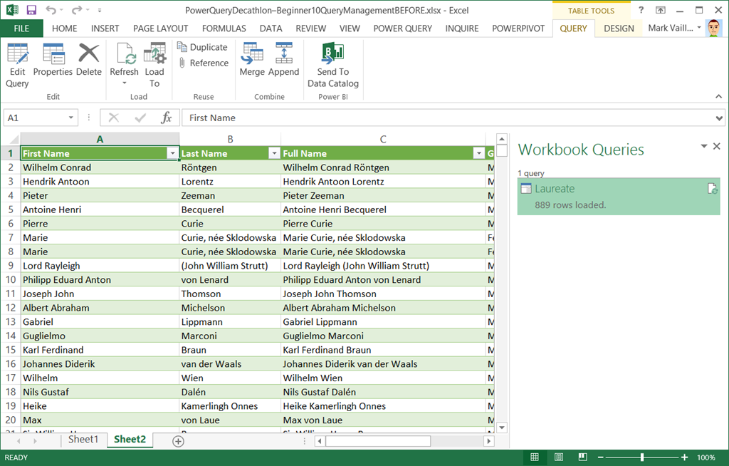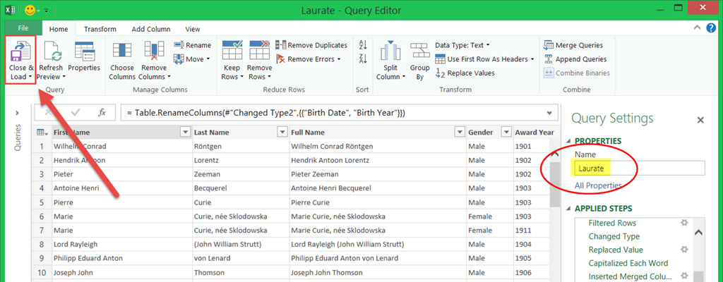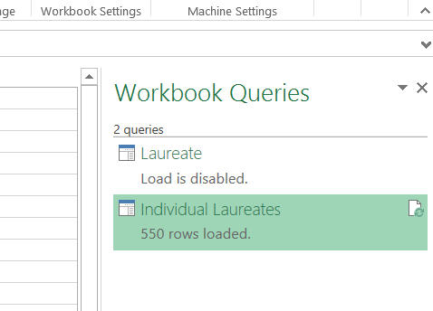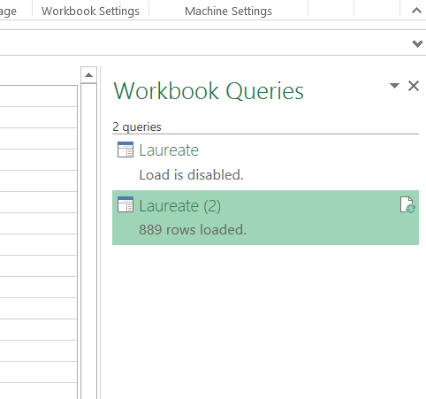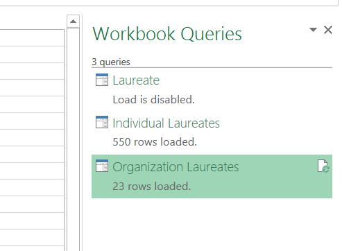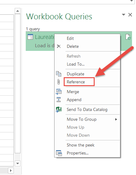 Note: When a Reference is made to a query by another, Laureate in this case, any changes to the referenced query can break the queries that reference it. So, in our example, making changes to Laureate could cause the other queries to become invalid. Just bear that in mind when deciding to use Reference.