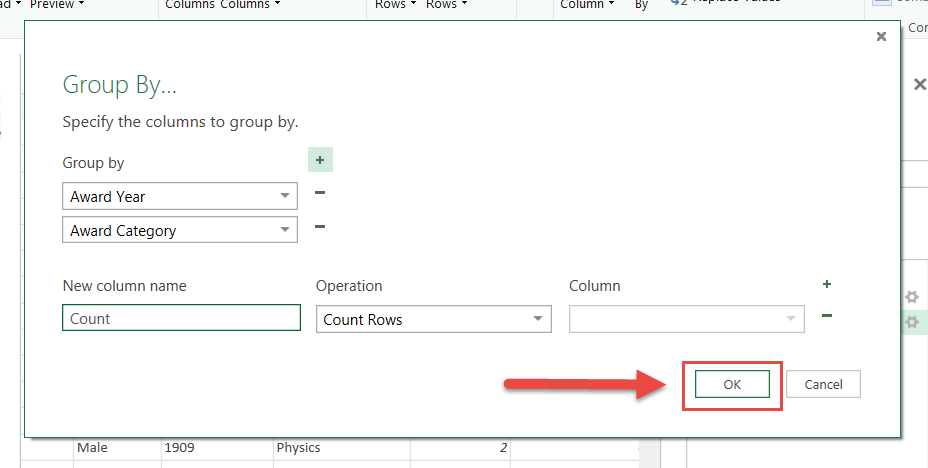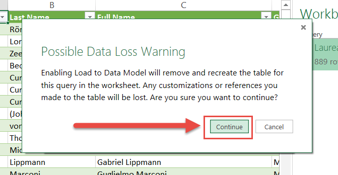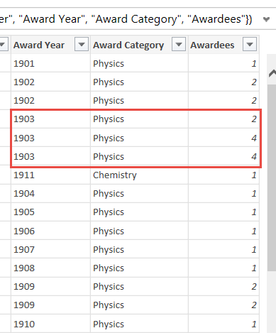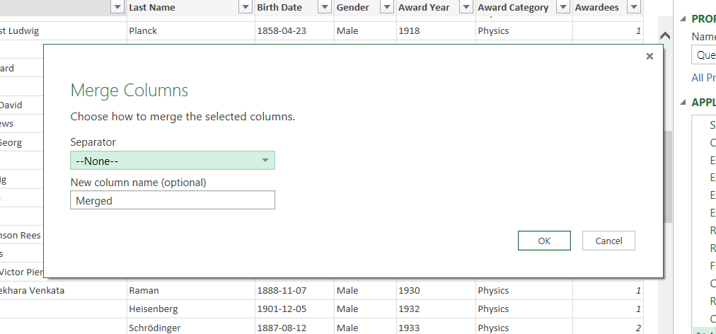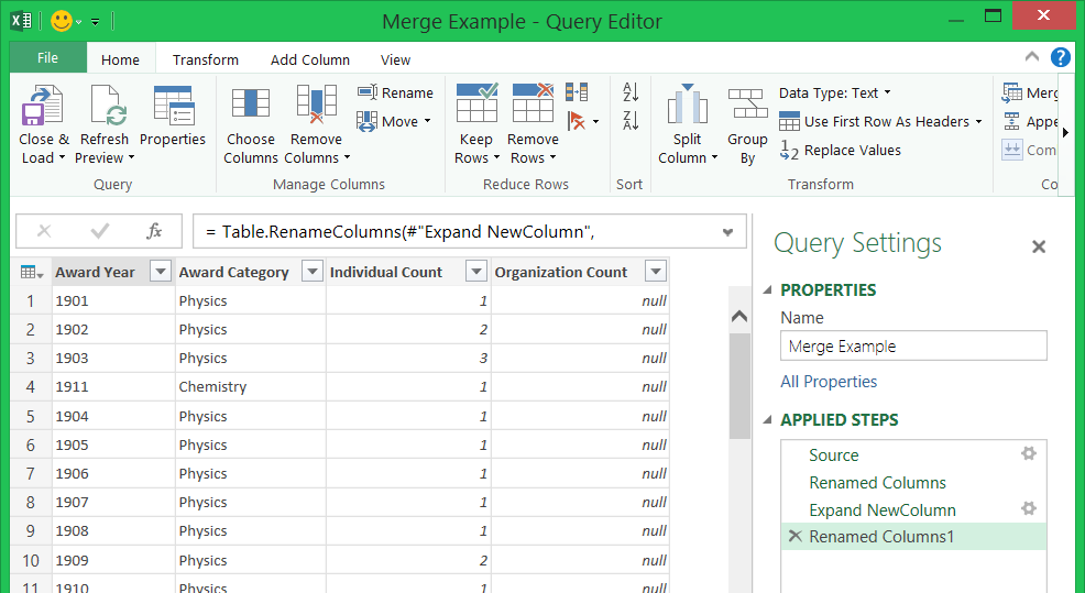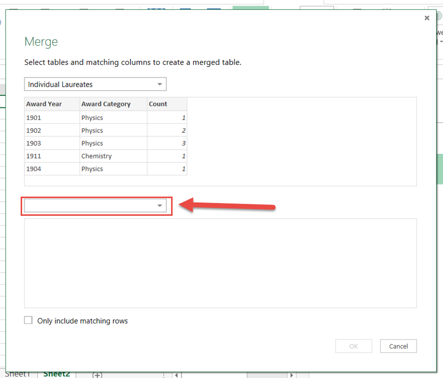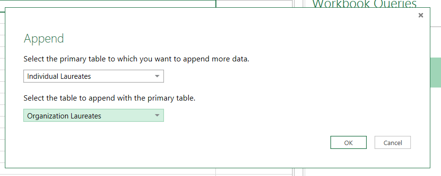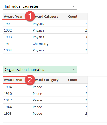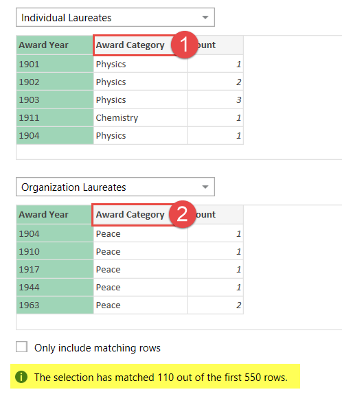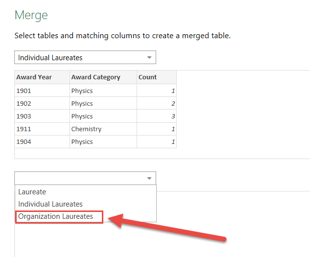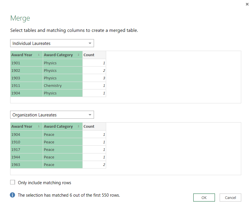 This is where we tell Power Query which columns to use for merging the tables so that rows in Individual Laureates can find matching rows in Organization Laureates.