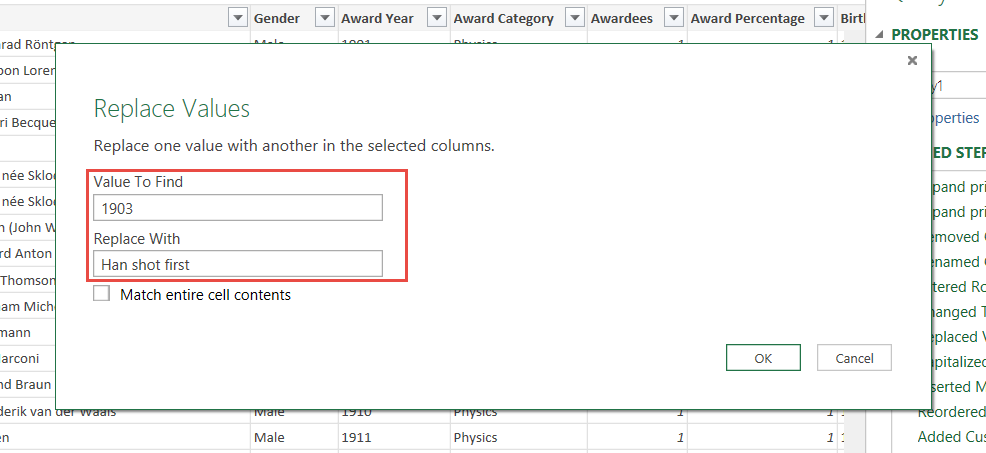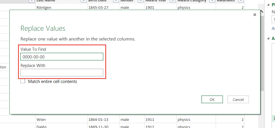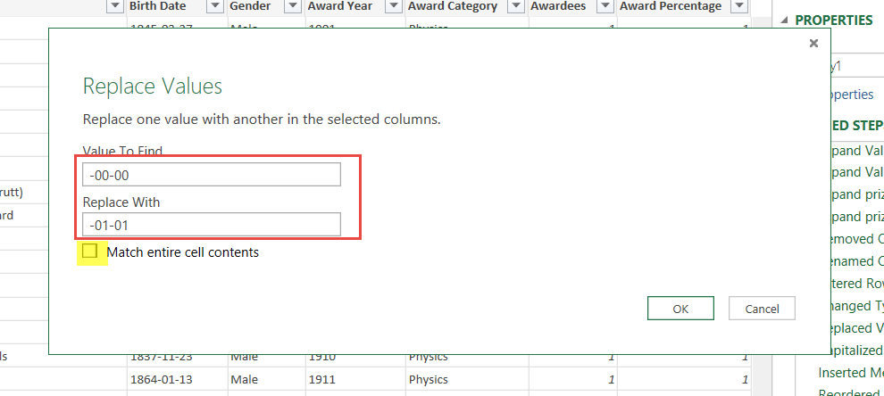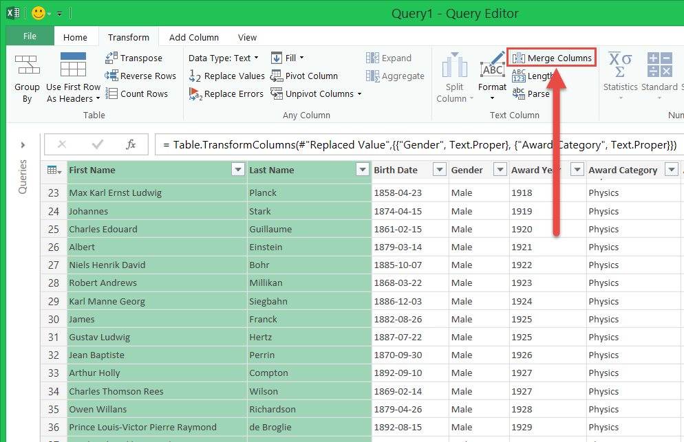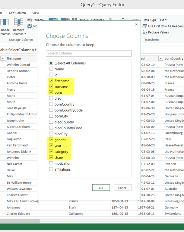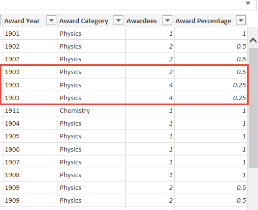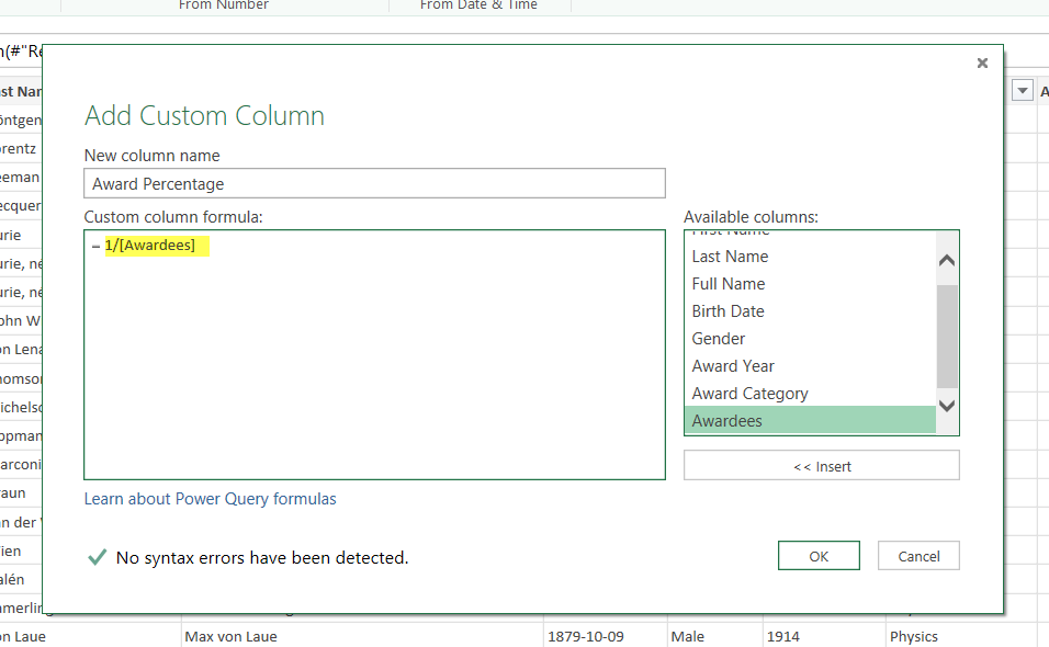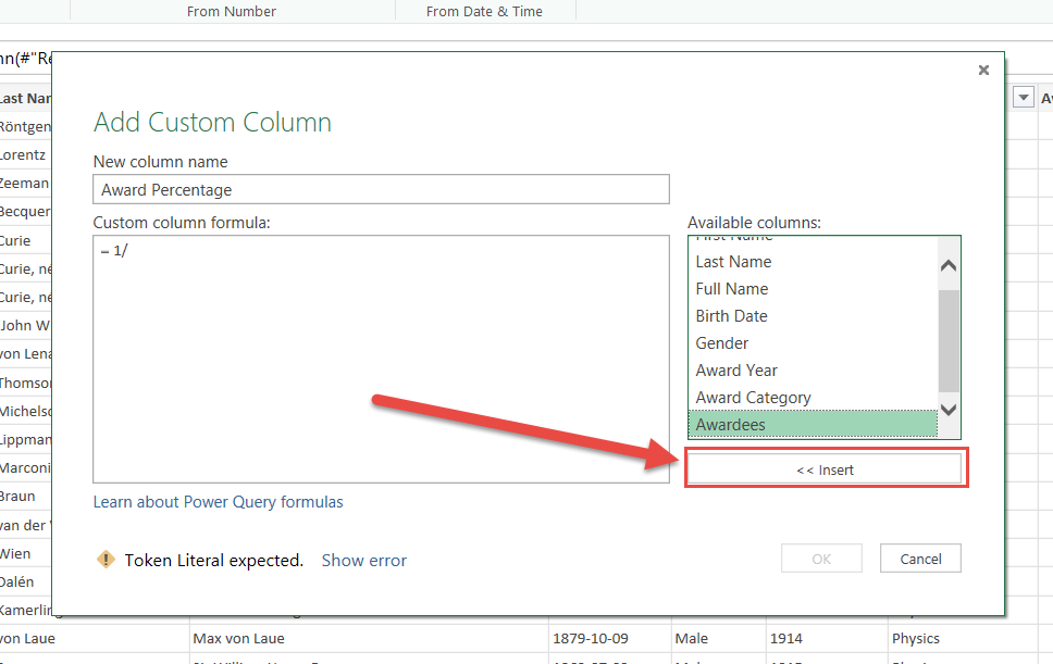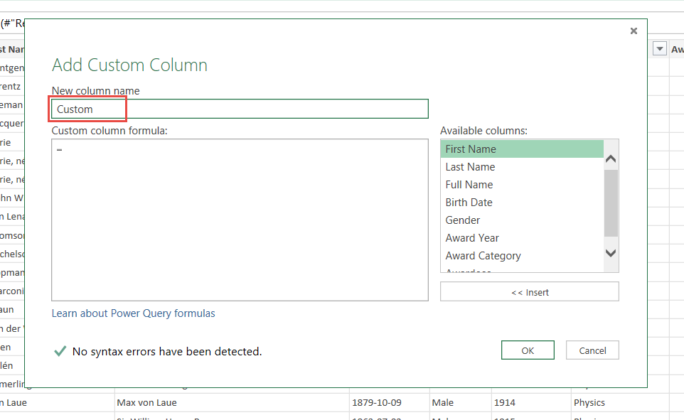This is where we tell Power Query which columns to use for merging the tables so that rows in Individual Laureates can find matching rows in Organization Laureates.