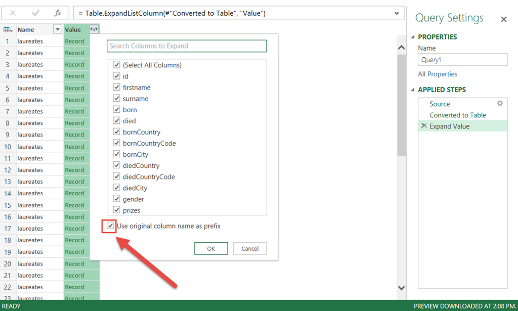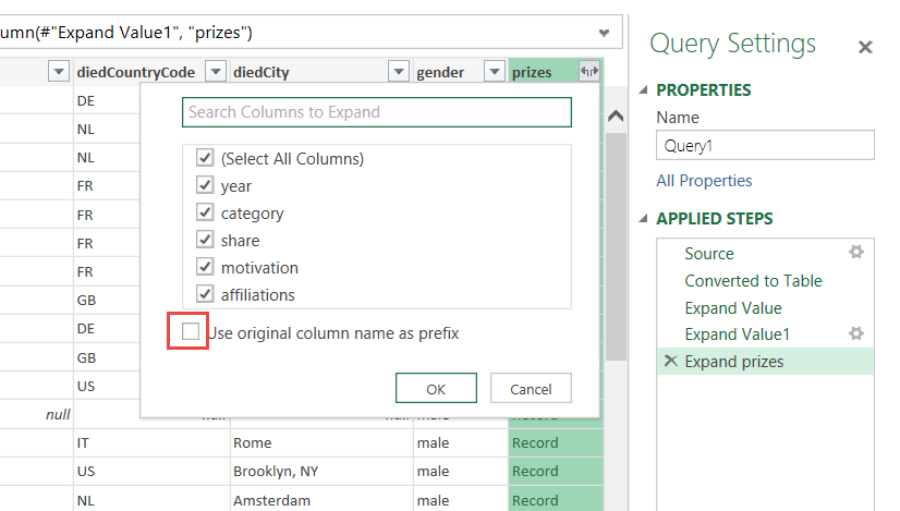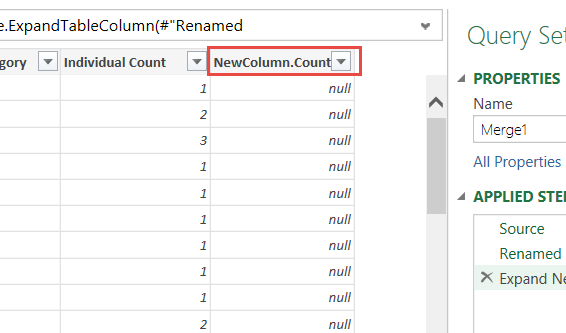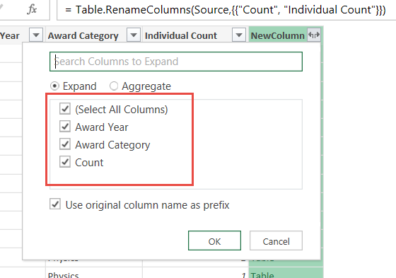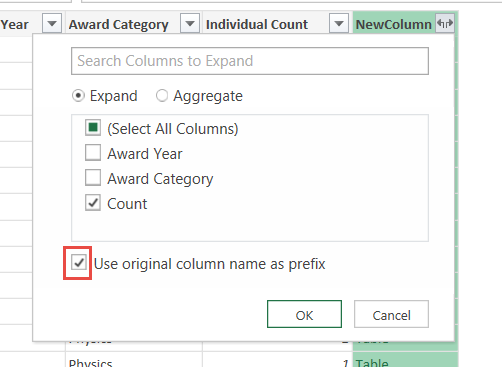 Note the “Use original column name as prefix” checkbox. With this checked, the default, the new columns pulled from this query will be prefaced with “NewColumn” since that is the name of the merged column. I typically turn that off but will leave it on here in order to show what that looks like.