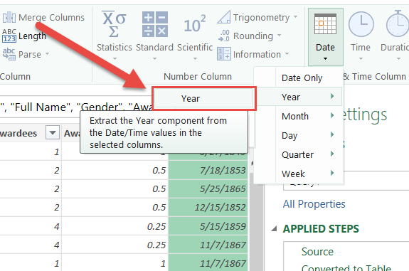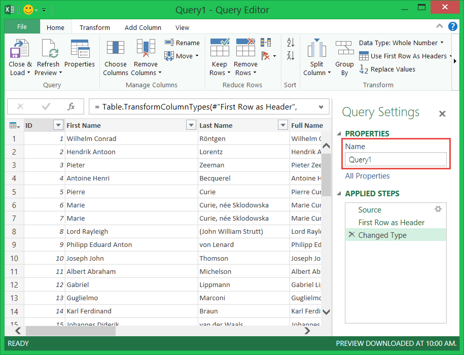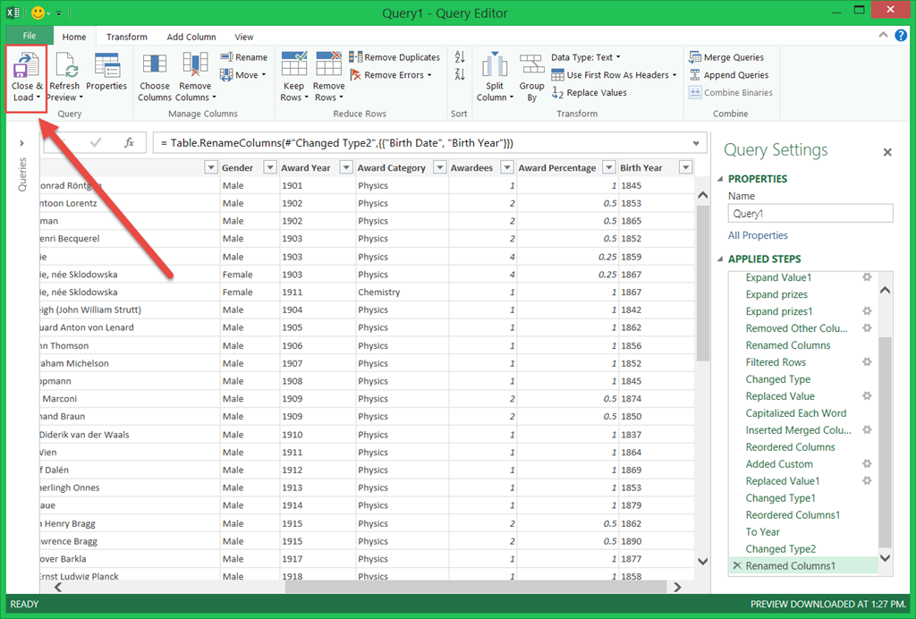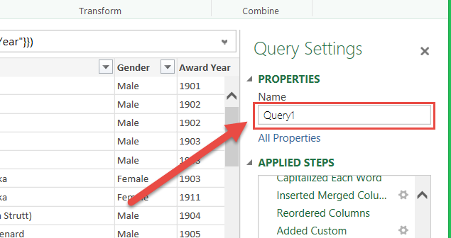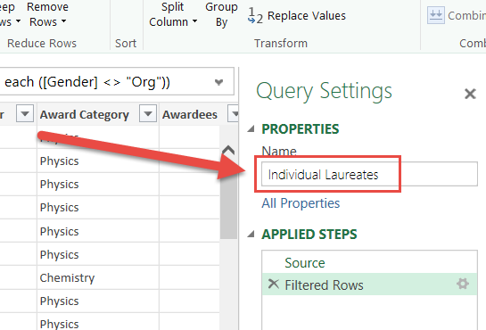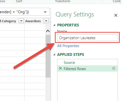 6. Change the name of the query, in the PROPERTIES box to Individual Laureates, as shown in Figure 7.