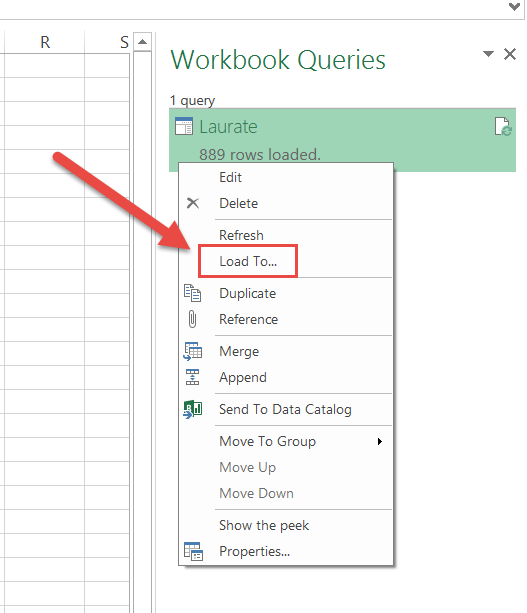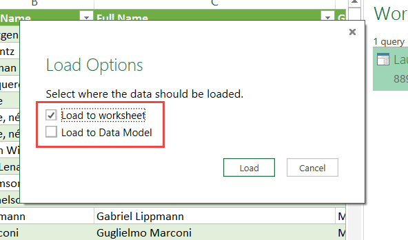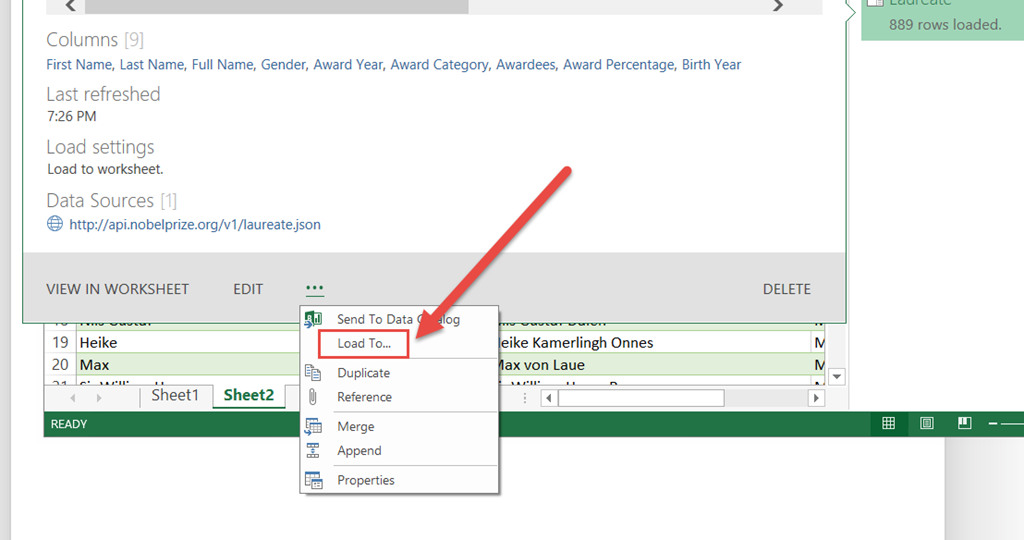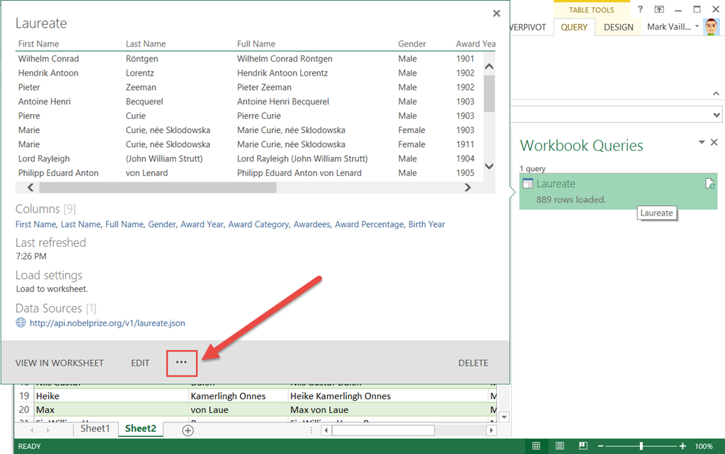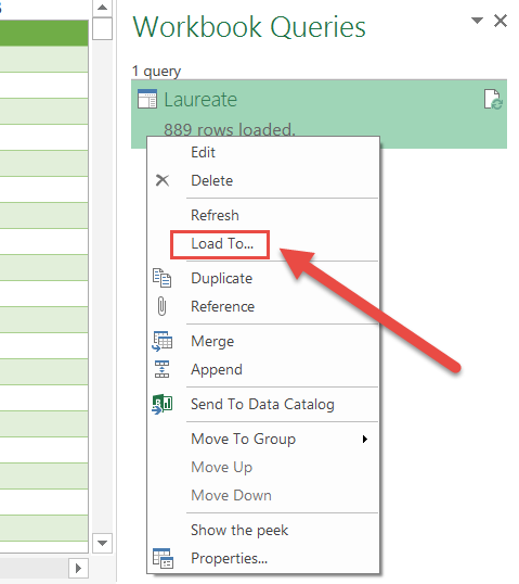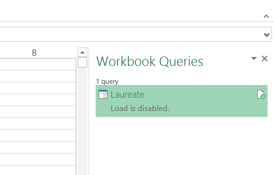 - Refresh – This will execute this query, loading fresh data to the configured Load destination. The Laureate query in Figure 1 is set to Loan nowhere, so the Refresh button is grayed out.