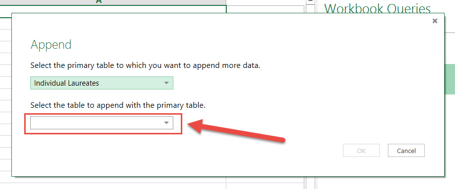 The query we chose, Individual Laureates, appears in the top section. This will be out main table. In the bottom section, we will choose the table from which to add columns to Individual Laureates.