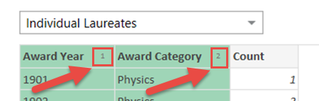 24. Ctrl-Click the Award Category column heading under the Individual Laureates query, shown by the 1 in Figure 22. You must use Ctrl-Click so that Power Query knows that you are specifying an additional join column and not changing the join column selection you initially made.