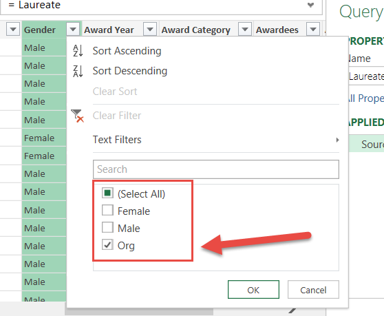 12. Edit that query to return ONLY the Org values from the Gender column, as shown in Figure 12.