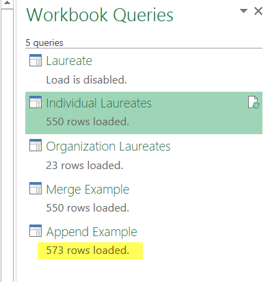 The Append Example query has 573 rows (550 from Individual Laureates and 23 from Organization Laureates).