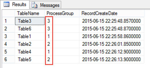 Here you can see that, although the executions for Process Group 1 and Process Group 2 started before that of Process Group 3, the parallel nature of this solution meant that Process Group 3 could still finish first as it is independent of the other Process Groups. We can confirm this by querying the tables with the query we used earlier, ordering the results by RecordCreateDate.
