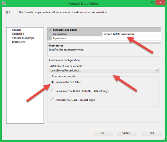 The next step in the package, marked with the 2 in Figure 2, is a For Each Loop that iterates through each row residing in the User::StoredProcedureList variable. That configuration is shown in Figures 7 and 8.