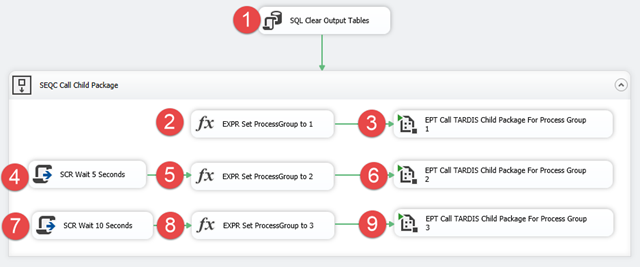 Step 6 then calls the TARDIS Child package a second time. But this time, then TARDIS Child gets a value of 2 for its User::ProcessGroup variable. As of that moment, TARDIS Child now essentially exists twice in Time and Space, just slightly offset.