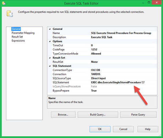 The User::StoreProcedure variable was populated by the For Each Loop. The User::ProcessGroup variable will be passed from the Parent Package. For now, if we assume that value is 1, we end up with the following stored procedure call passing to the database:
