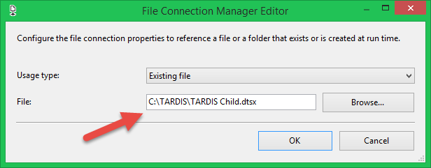 Step 3 is the first Execute Package task calling TARDIS Child. Thanks to the Parent Package Variable configuration, TARDIS Child will get the value 1 for its User::ProcessGroup variable. The only setting I made here was in setting the connection manager to the TARDIS Child.dtsx file. That connection manager is shown in Figure 15.