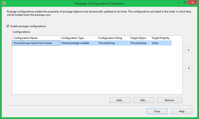 I mentioned that the TARDIS Child package would get the value of the User::ProcessGroup variable from the TARDIS Parent package. This is accomplished via a Parent Package Variable configuration, as shown in Figure 12.