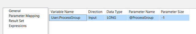 The task is configured to pass the value of the User::ProcessGroup variable as the @ProcessGroup parameter for the stored procedure, as shown in Figures 4 and 5.