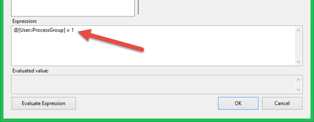In Step 2, I use the Expression Task to set the value of the User::ProcessGroup variable to 1. The configuration of that task is shown in Figure 14.
