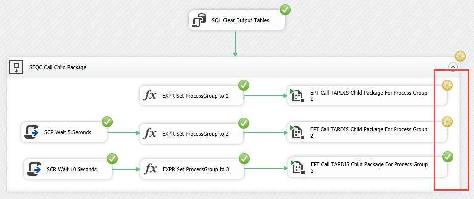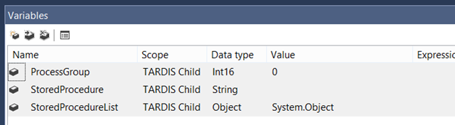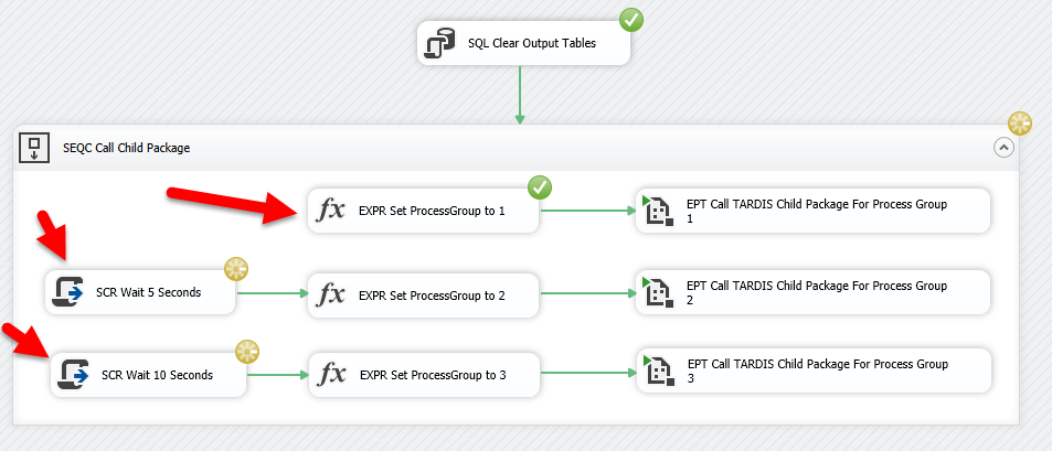 When the TARDIS Parent package tells the TARDIS Child package to execute, the TARDIS Child will look at the User::ProcessGroup variable on TARDIS Parent and take that value for its own User::ProcessGroup variable. The fact that the User::ProcessGroup variable of TARDIS Parent can only have a single value (at a time) meant I needed a way for each execution of TARDIS Child to get a different value. My solution ended up being pretty timey wimey.