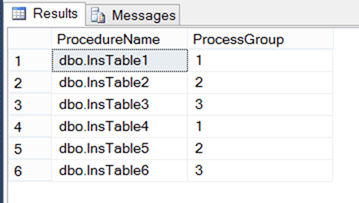 The purpose of this table is to control the Process Group to which each stored procedure belongs. I also created each of those stored procedures. They each insert the Process Group value passed into them into their respective tables.