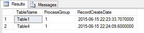 Since the stored procedures dbo.InsTable1 and dbo.InsTable4 were run serially, with dbo.InsTable1 going first, the RecordCreateDate for Table1 is earlier than that of Table4. Later, when we run all process groups, the RecordCreateDate will be the proof that the TARDIS solution works. The reason is that of the stored procedures, InsTable1 thru InsTable6, four of them have some manner of delay in their processing. For example, InsTable1 has the following definition: