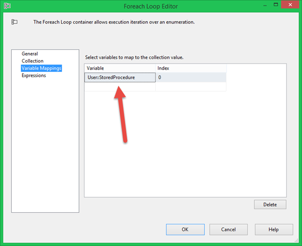 The first time through the loop, the User::StoredProcedure package variable will get the value ‘dbo.InsTable1’ which is the first row shown in Figure 6.