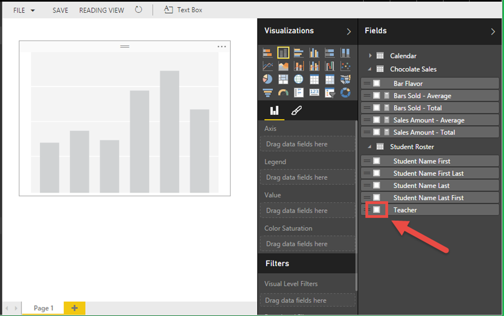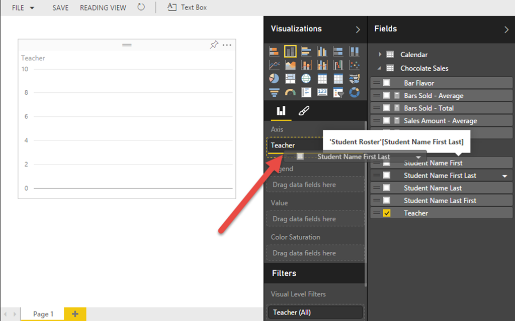 Figure 2 shows the empty Column Chart. I’ll click the box for the Teacher field, shown by the arrow. This leads to Figure 3.