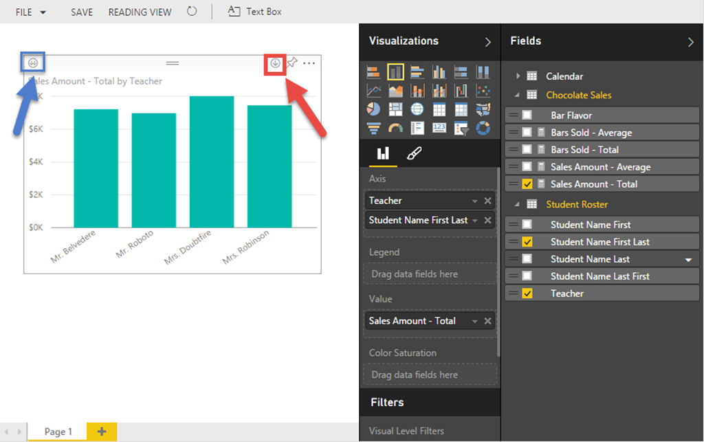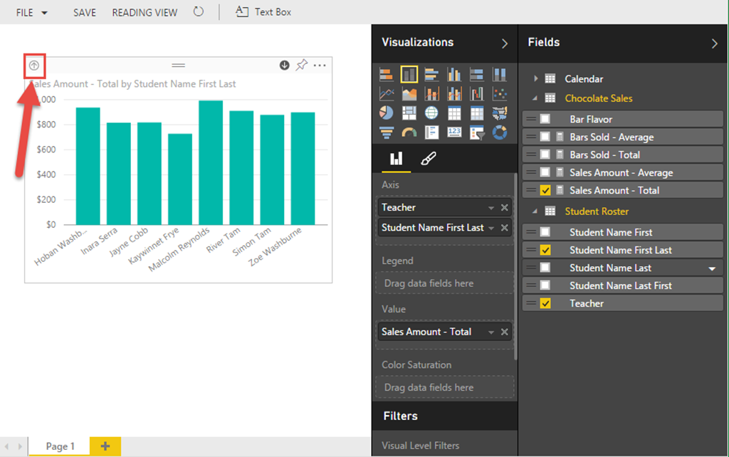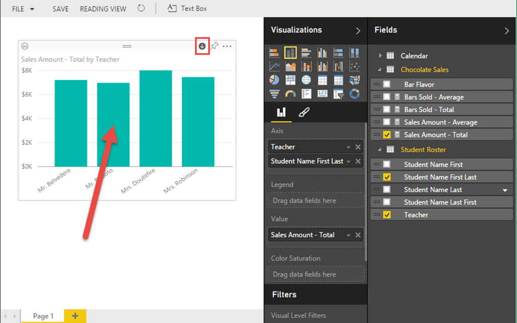 Instead of cross-filtering, we have drilled down one level from Teacher to Student Name First Last, showing the Sales Amount – Total for each student in Mr. Roboto’s class. Hazzah! We can then click the Drill Up button, shown by the Red arrow in Figure 10 to go back up to the Teacher level, as in Figure 11.