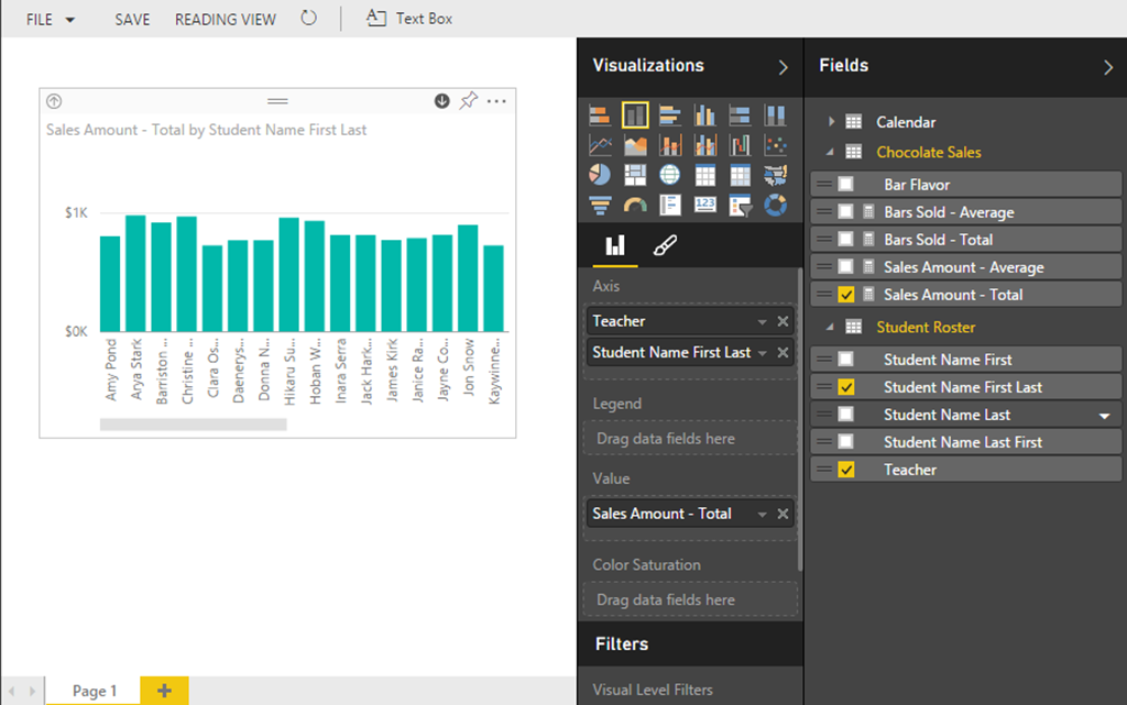 In my Free Power BI account (I have a Free one and a Pro one for testing, etc), I have a dataset related to students selling chocolate for a school fundraiser. I decided to be really cryptic and called it Chocolate Sales.
