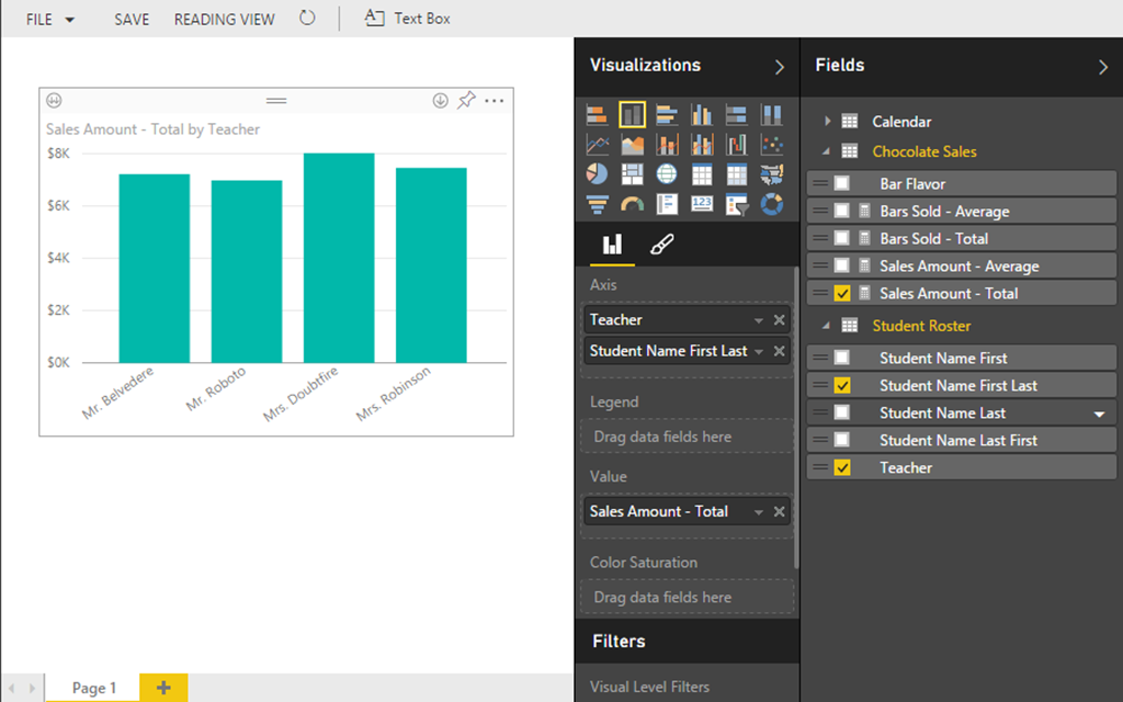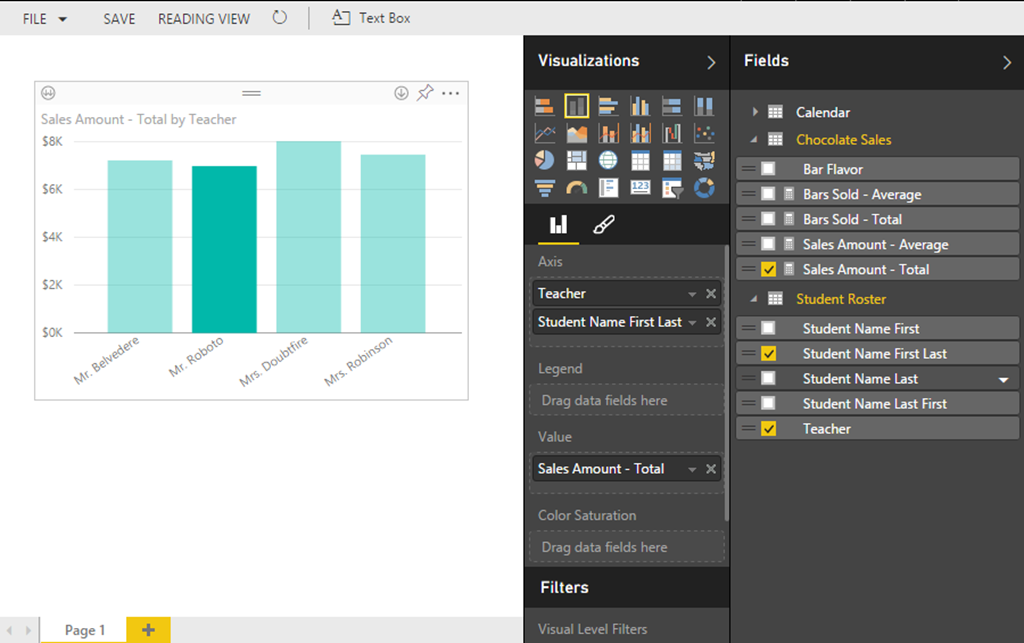 You can see in Figure 7 that the columns for the other Teacher values have become transparent, making Mr. Roboto stand out. Thank you very much, Mr. Roboto, for helping me demonstrate just what I needed to. Thank you. If we had other visualizations on this page, they would be filtered for just Mr. Roboto’s class.