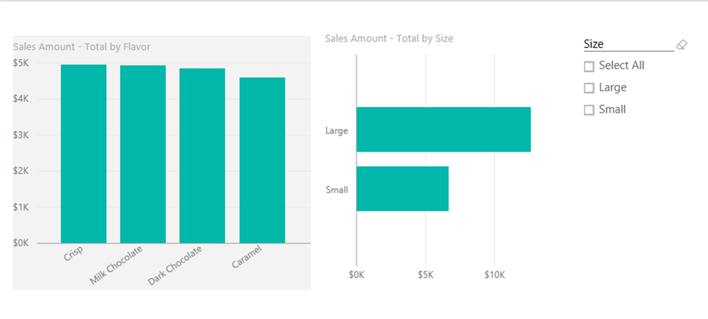 Slicers actually remove the values that do not meet the filter from the visuals entirely. For example, if we click the Large option on the Size slicer, we get the view shown in Figure 3.