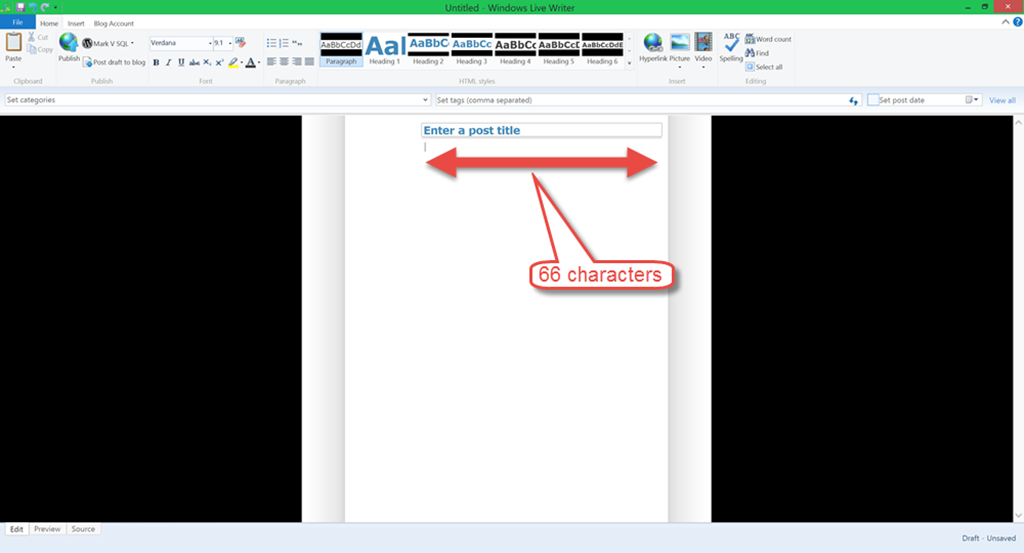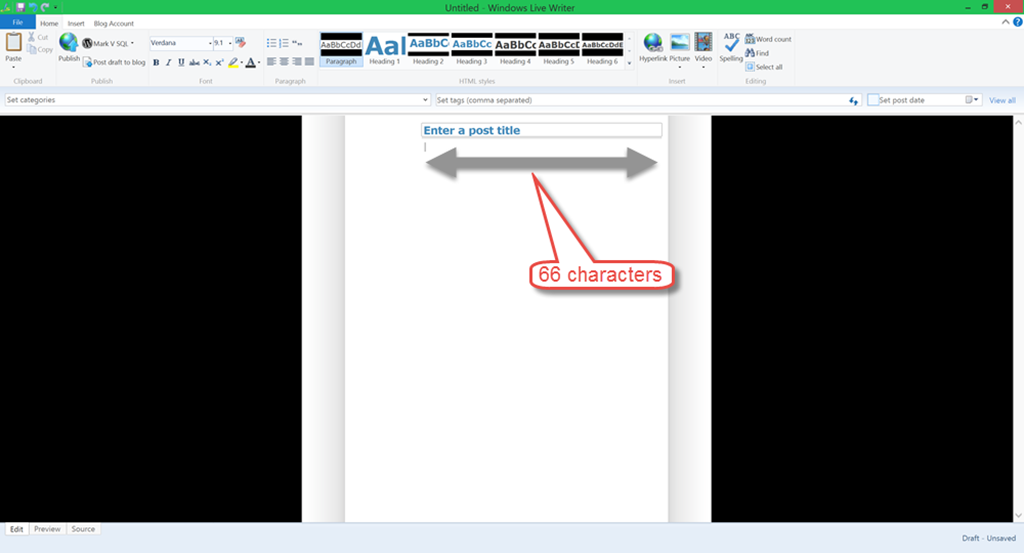 Yuck. The writing surface is only 66 characters wide. That makes laying out posts very difficult since the writing surface is just a bit more than half of what I am used to and the posts will display on my blog.