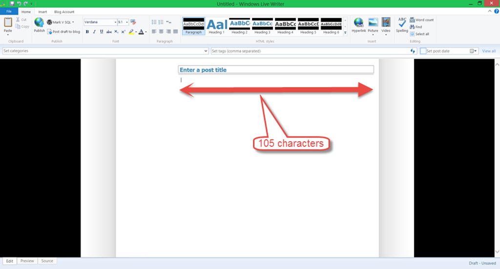 I love Live Writer for blogging. I have used it for years. I will continue to use it until they pry it from my cold, dead hands. However, since using some high DPI (that Dots Per Inch) laptops over the past several months, I have had trouble with it. On very high DPI, the scale was way off and the usable writing surface was very narrow. Figure 1 shows what Live Writer looks like for me on default settings in Windows 8.1 on a Dell XPS with 3200×1800 resolution.