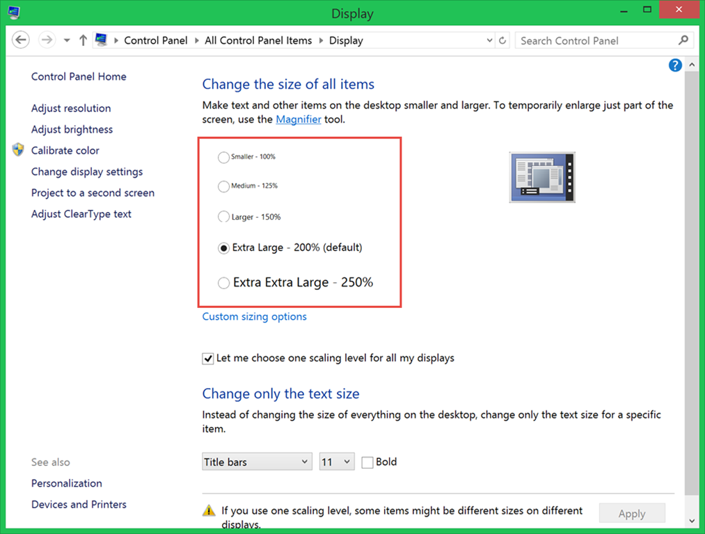 In this perspective, it is easy to see the difference. So, the settings that work just great for me are shown in Figures 5 and 6 respectively. I just make these changes when I am going to be blogging. Not that changing the Size of All Items setting does require you to log off and then back on to take effect.