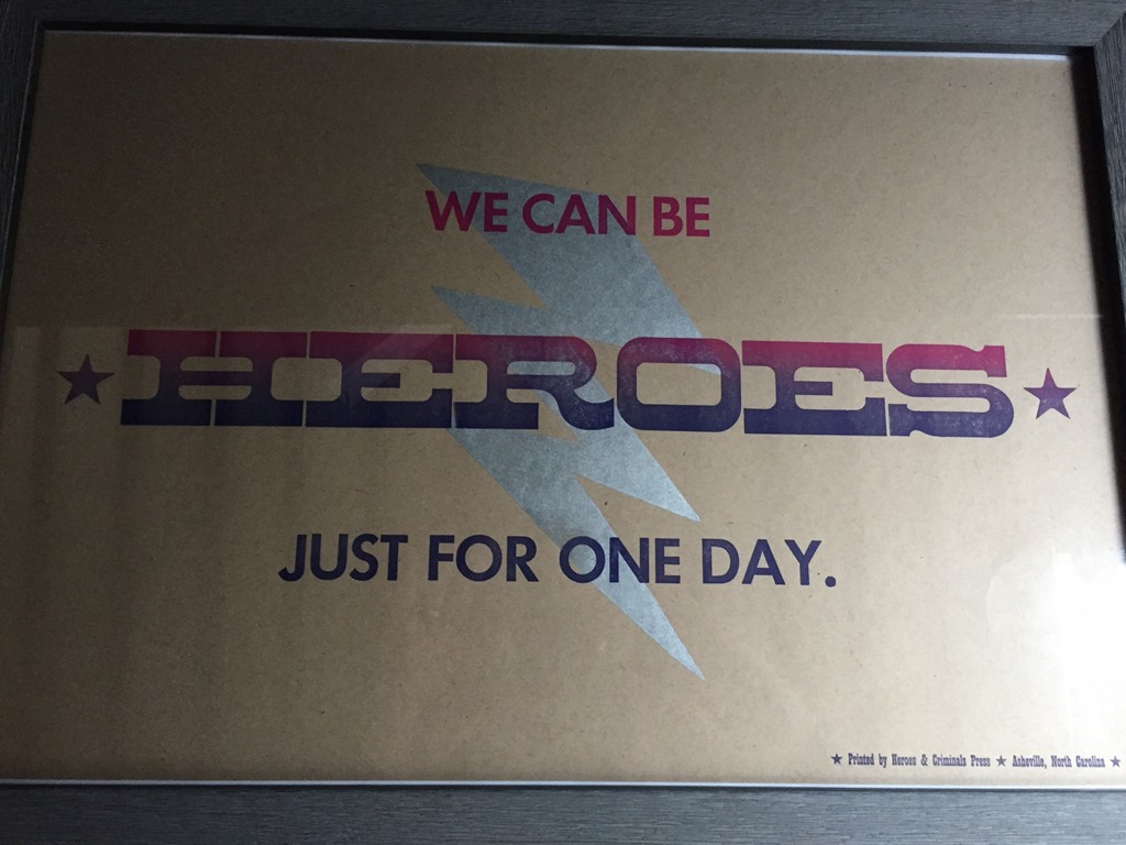 The image at the right is one of Paige’s birthday presents. She’s a fan of David Bowie and we got her this poster and framed it for her room. It seems so fitting now that she have a poster about being a hero when she is one.
